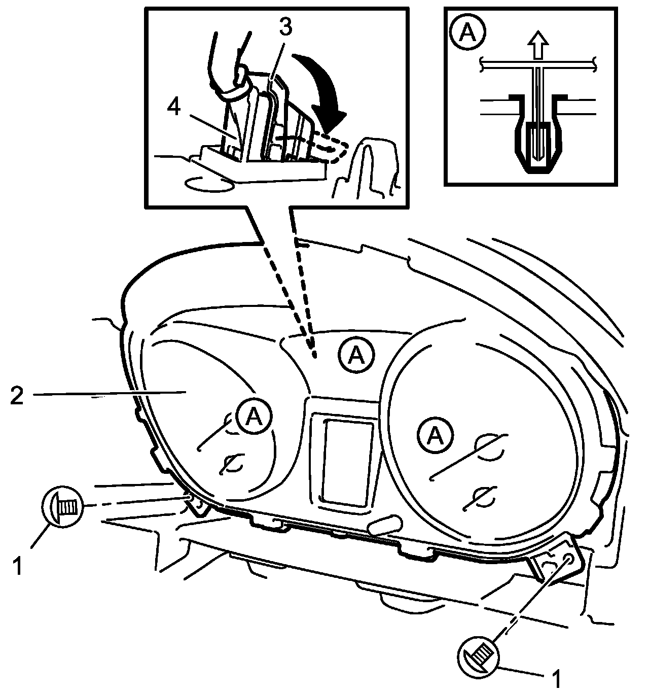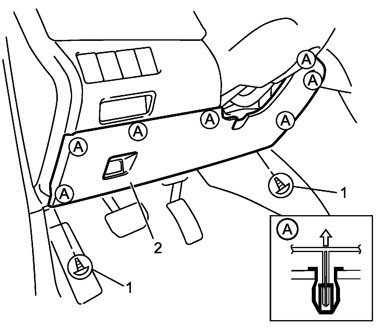 8. Remove driver side instrument panel inside garnish (1), and then remove instrument panel cluster panel (2).