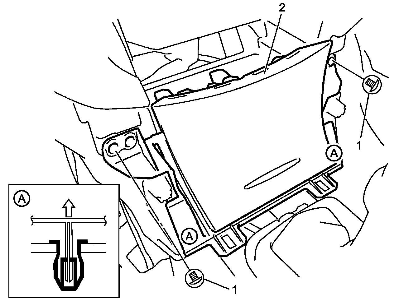 6. Remove screws (1) and remove instrument panel center lower box (2).
