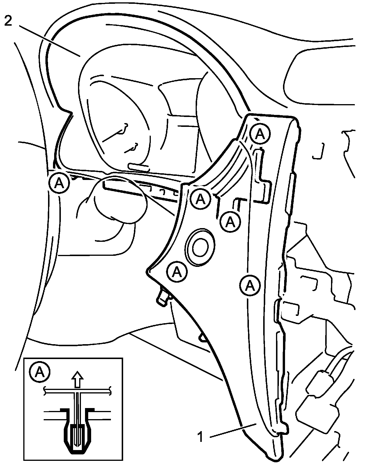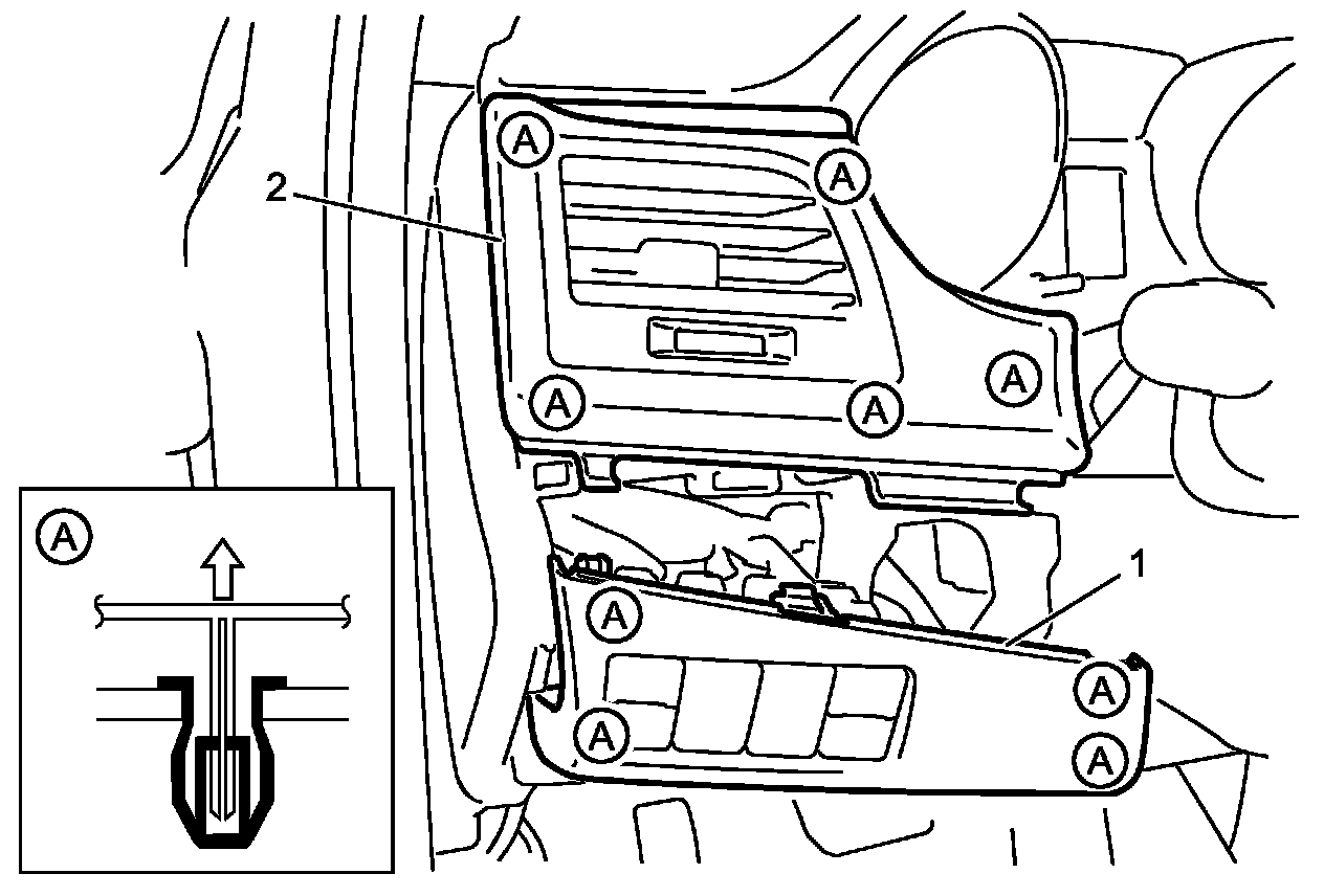 7. Remove instrument panel switch bezel (1), and then remove driver side instrument panel outside garnish (2).
