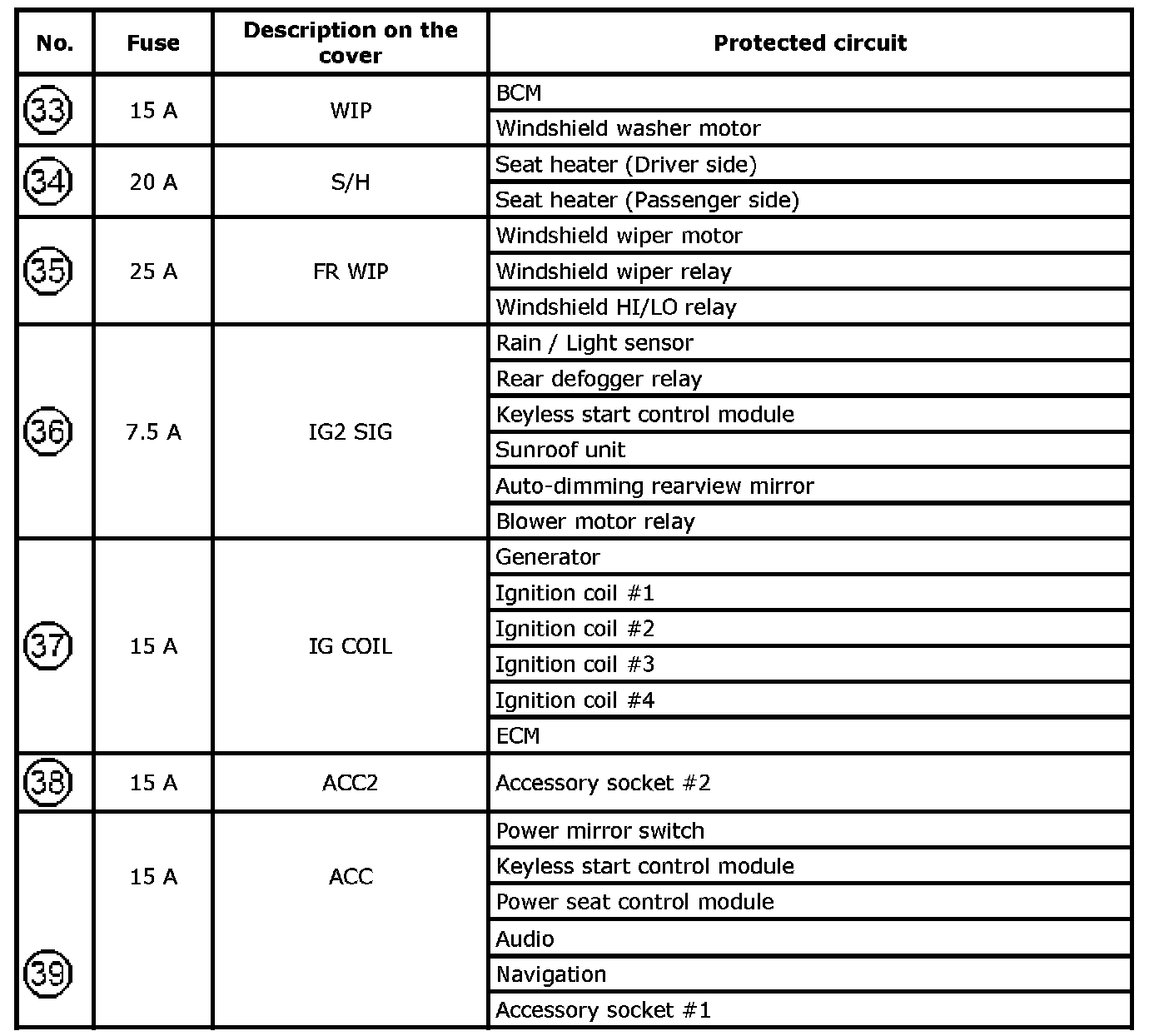 Fuse Box No. 2 Application Table Fuse 33-Fuse 39:
