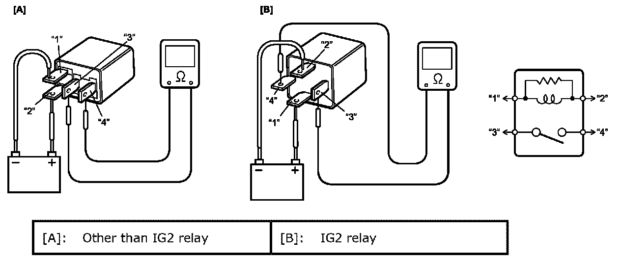 4. Connect battery positive (+) terminal and negative (-) terminal to relay as shown in figure, check for continuity between terminal "3" and "4".