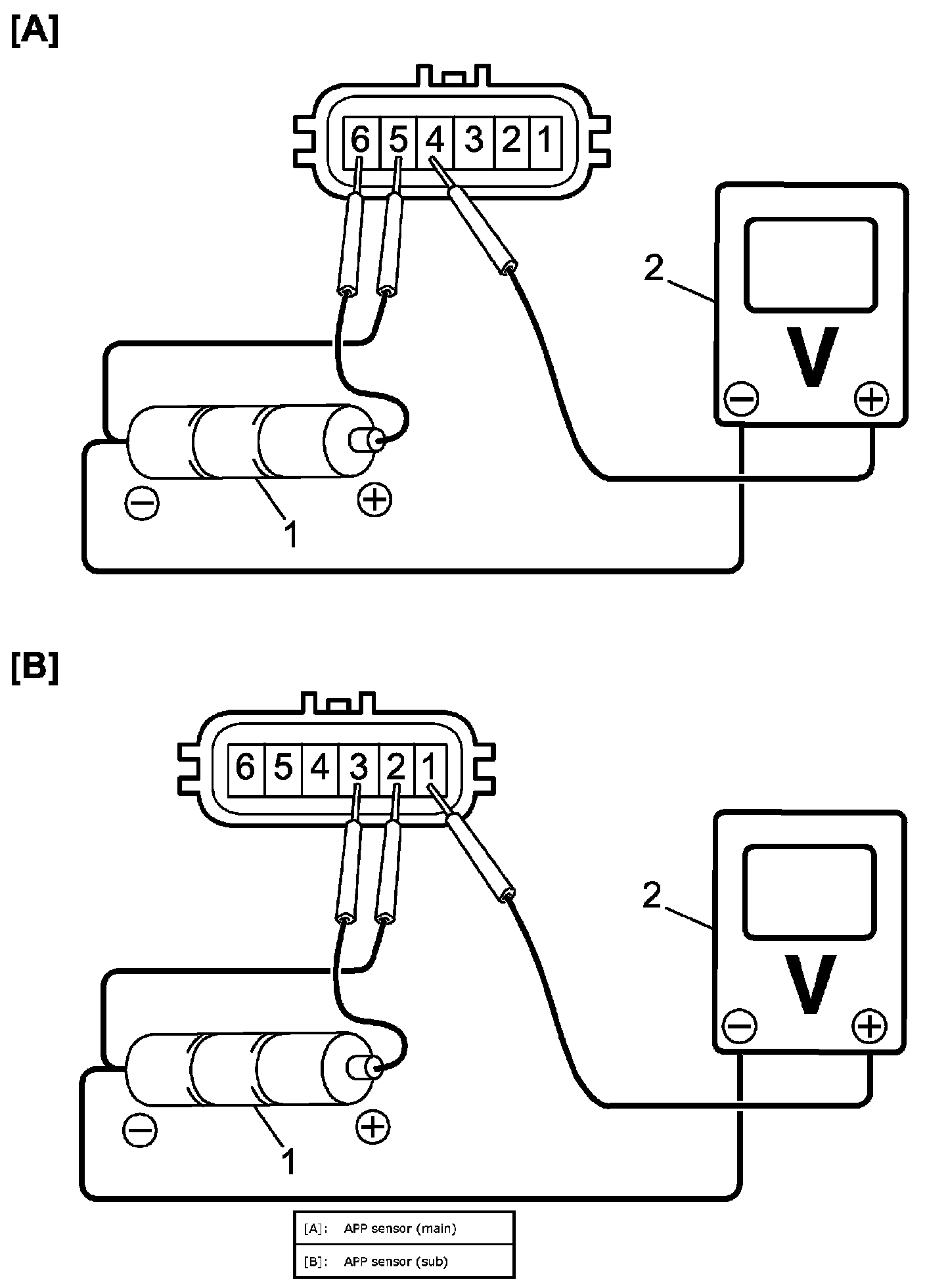 b. Connect voltmeter (2) and batteries to APP sensor as shown in figure.