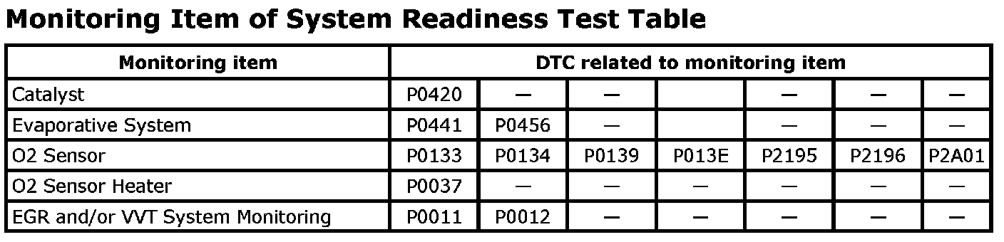 - By utilizing this system readiness test, it is possible to confirm that all DTC confirmation procedures for each system have been completed or are incomplete. For all DTCs related to each system, refer to the table below.