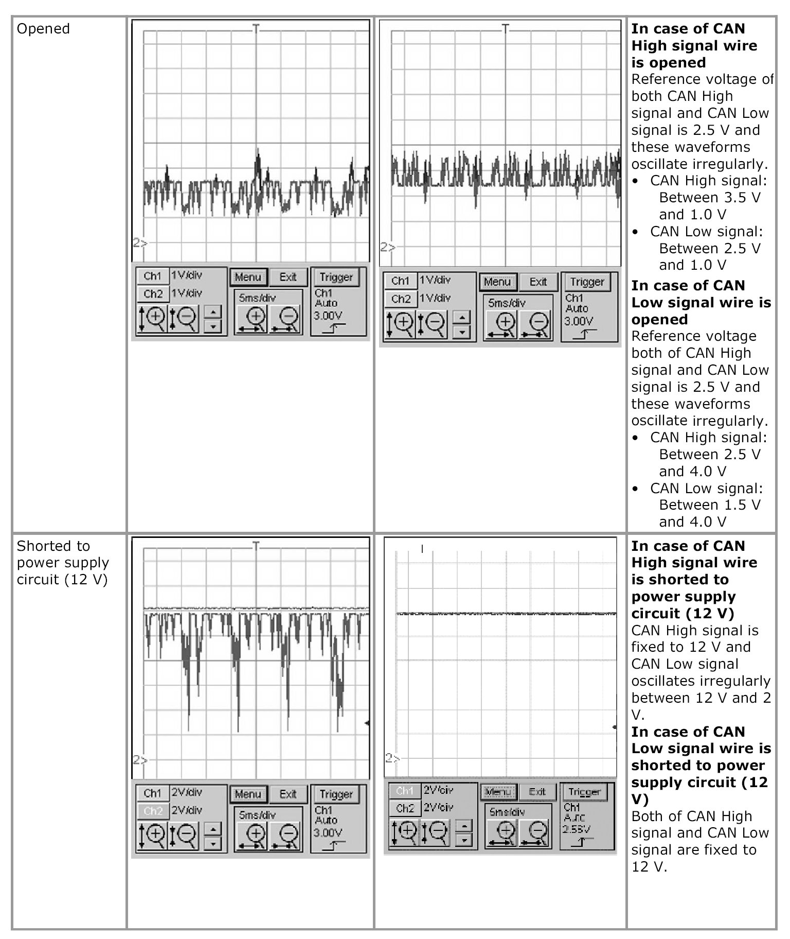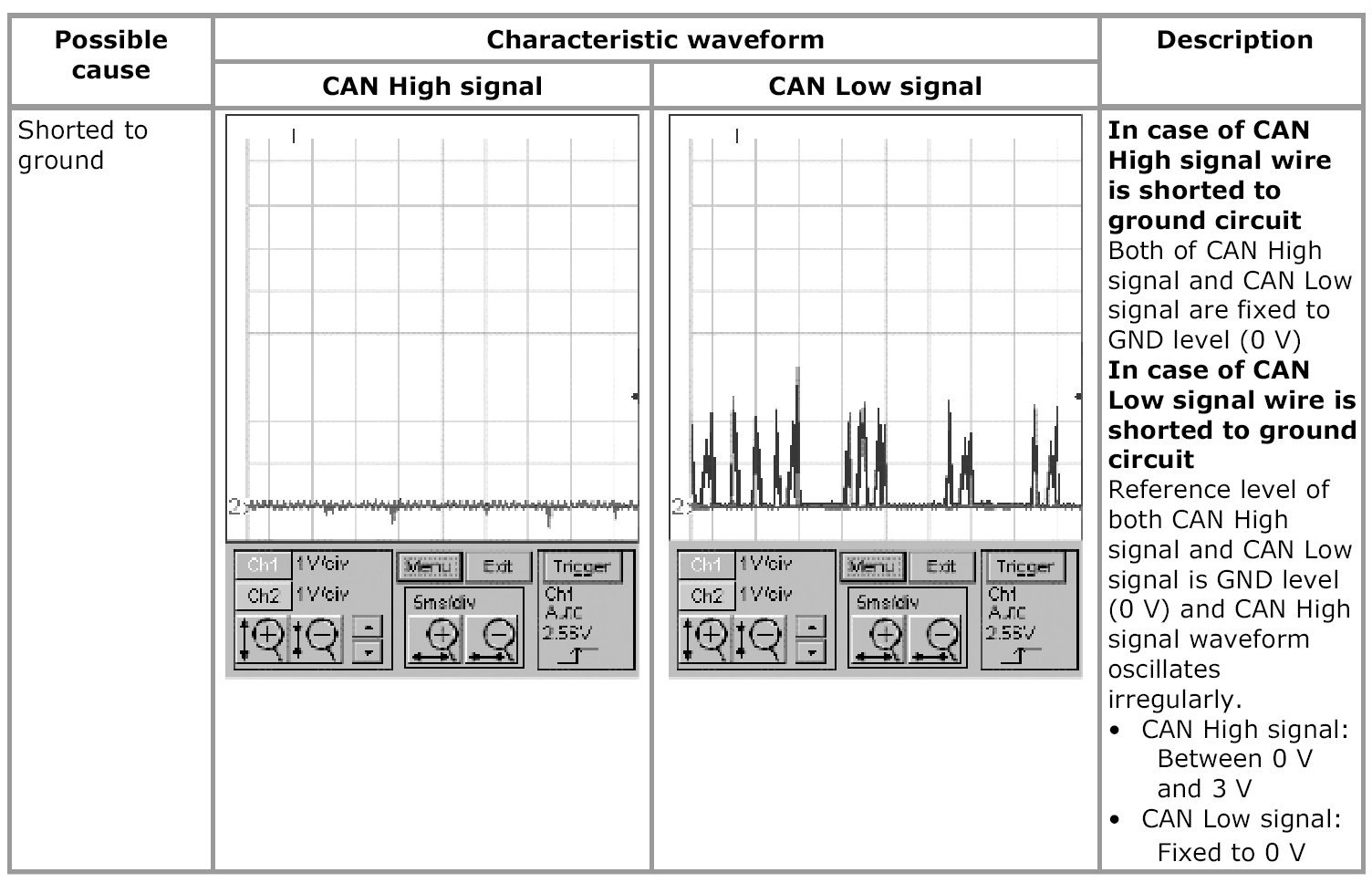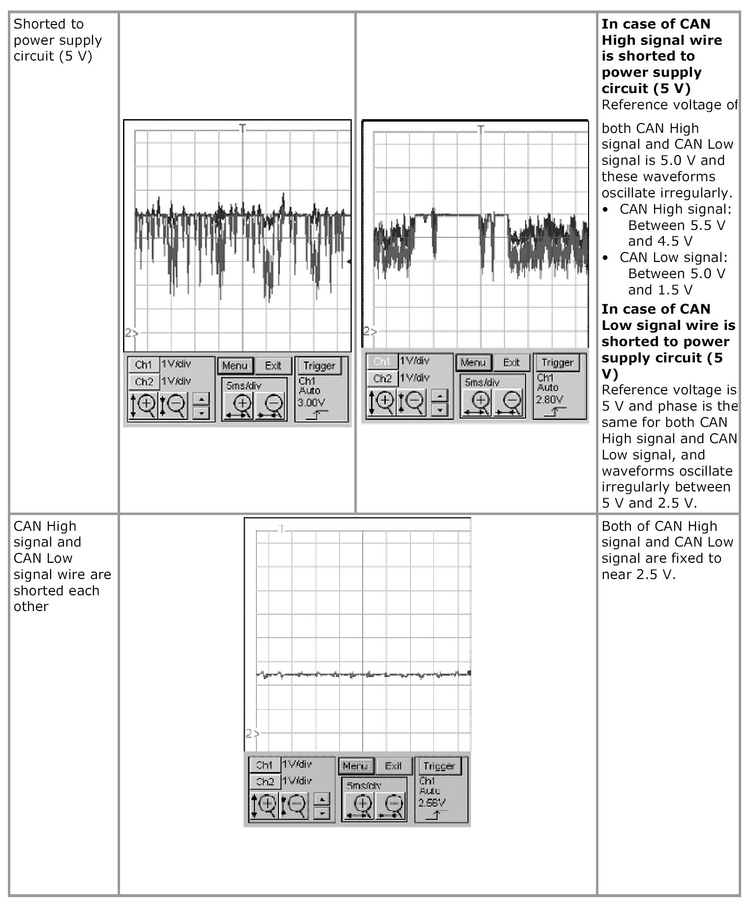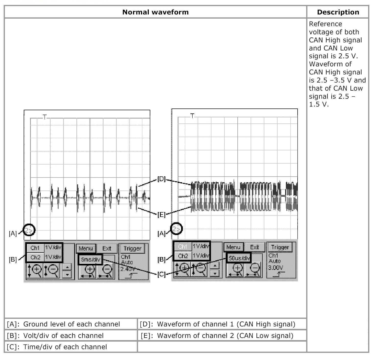 - Waveforms in "Examples of abnormal waveforms" are selected examples of CAN communication waveforms seen when an abnormality occurs. However, these waveform may not be exactly the same in appearance as observed waveforms. Therefore, to identify an abnormality, select the waveform that is most similar to the observed waveform from Examples of abnormal waveforms.