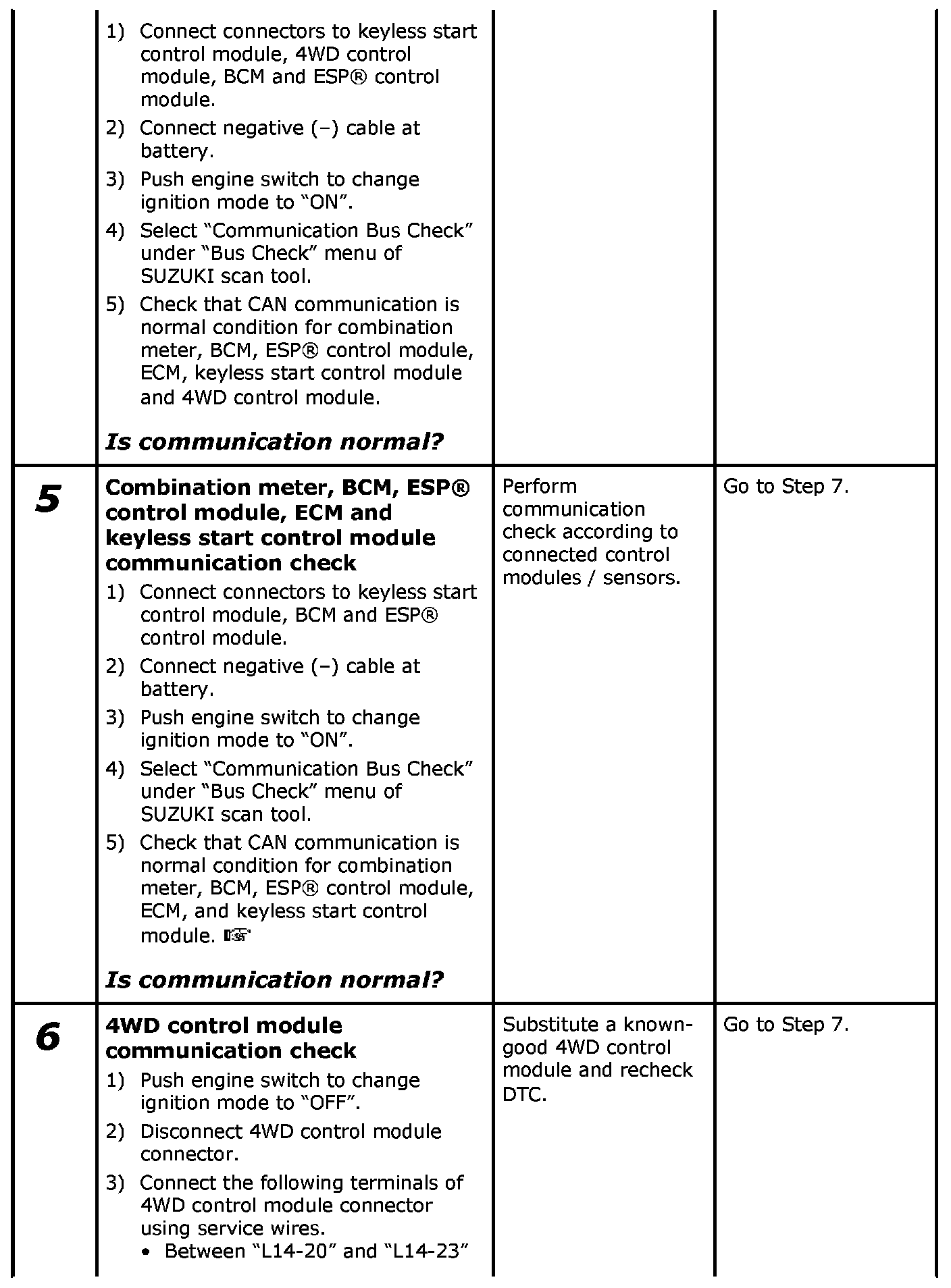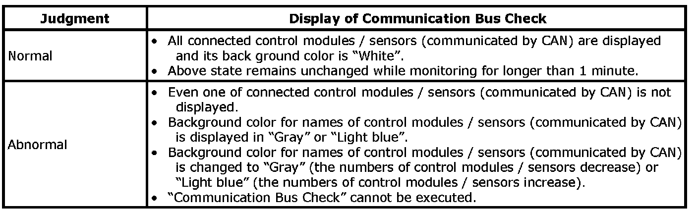 When performing "Communication Bus Check" by using SUZUKI scan tool, refer to the following table for judgment.