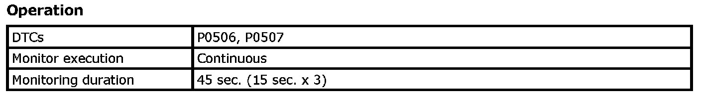 The IAC is checked throttle valve opening by monitoring the closed-loop idle speed comparing with the desired idle rpm. If the idle rpm is higher than the desired idle rpm by 200 rpm or lower than the desired idle rpm by 100 rpm, an IAC malfunction is detected. (P0507, P0506)