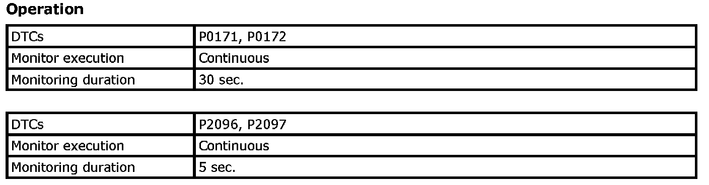 The ECM monitors the A/F sensor characteristic offset by monitoring the feedback condition of HO2S. When the sum of correction factor of HO2S system exceeds higher or lower value, the ECM will set DTC.
