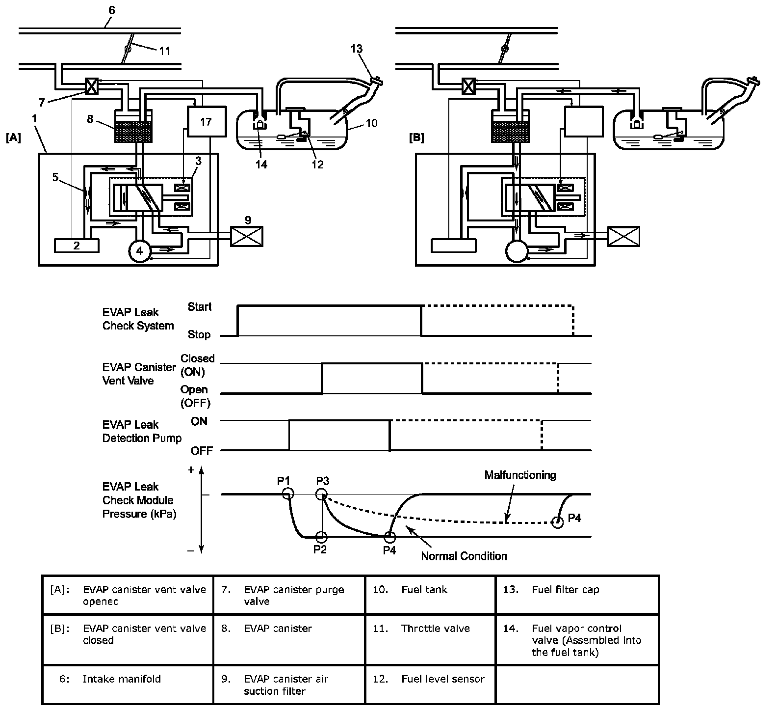 3. ECM measures tank pressure as EVAP system maximum pressure (P3) when EVAP canister vent valve is closed (ON) [B] with EVAP leak detection pump in operation.