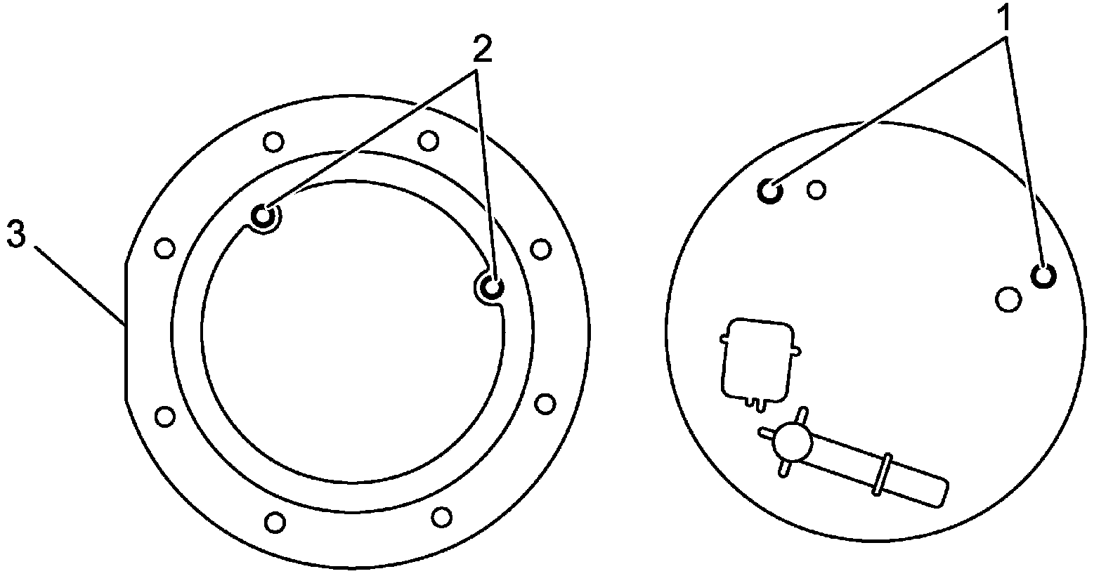 - Align protrusions (1) on fuel pump with aligning hole (2) on fuel pump plate.