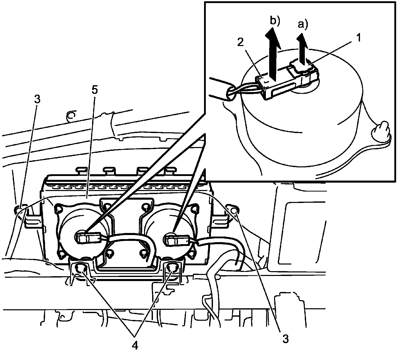 4. Remove passenger air bag (inflator) module screws (3) and passenger air bag (inflator) module bolts (4), and remove passenger air bag (inflator) module (5).