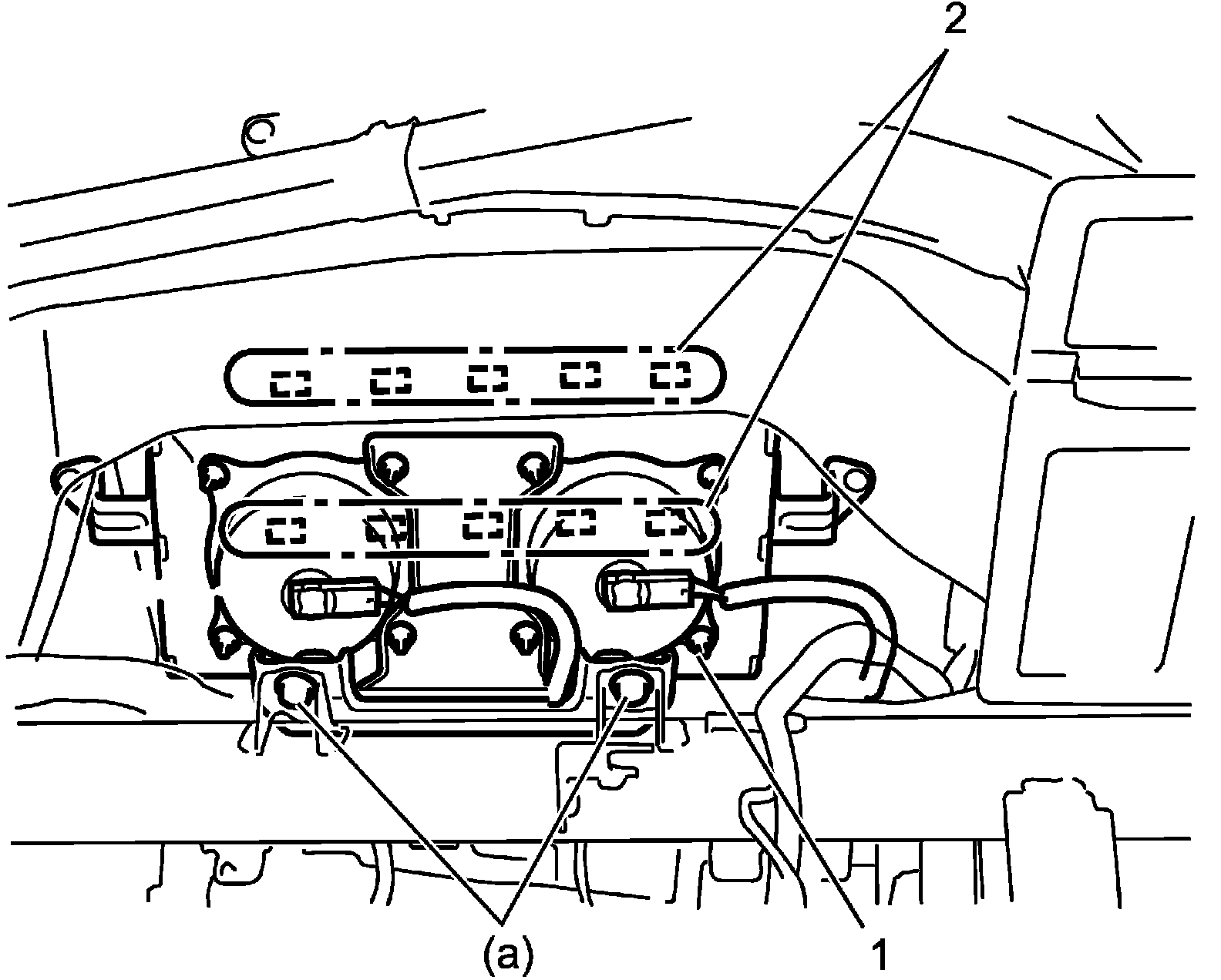 - Fit claw (2) of passenger air bag (inflator) module (1) to instrument panel securely.