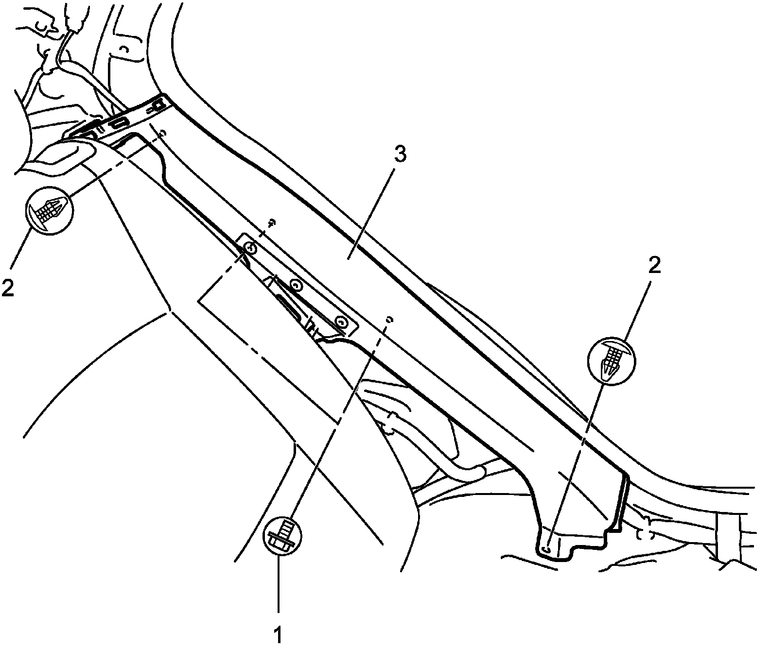 7. Remove rear side air bag (inflator) module bolt (1) and clips (2) and remove rear side air bag (inflator) module (3).