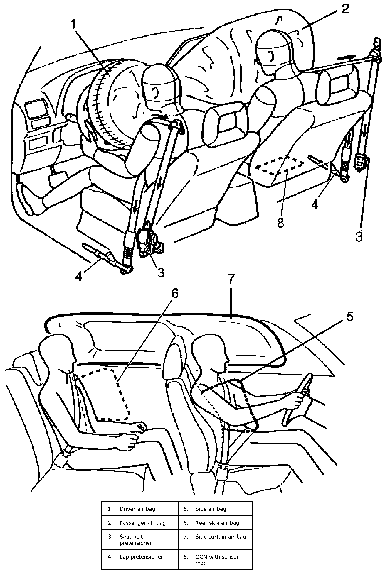 Air Bag System ConstructionTo supplement protection offered by seat belts, the air bag system includes the following air bags: front and side air bags for driver and passenger seats, right and left curtain air bags, and right and left rear side air bags. In addition to these air bags, the system also includes seat belt pretensioners and lap pretensioners for driver and passenger.