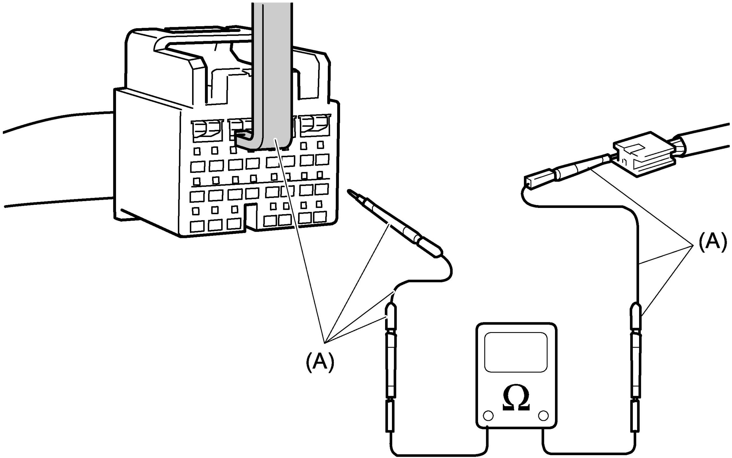 - When conducting continuity check of wiring harness or removal check of connectors, be sure to use the special tool (A). Since terminals are chrome-plated to improve the electric conductivity, the direct contact of tester probe with terminals may peel off the plating causing a loss of reliability.