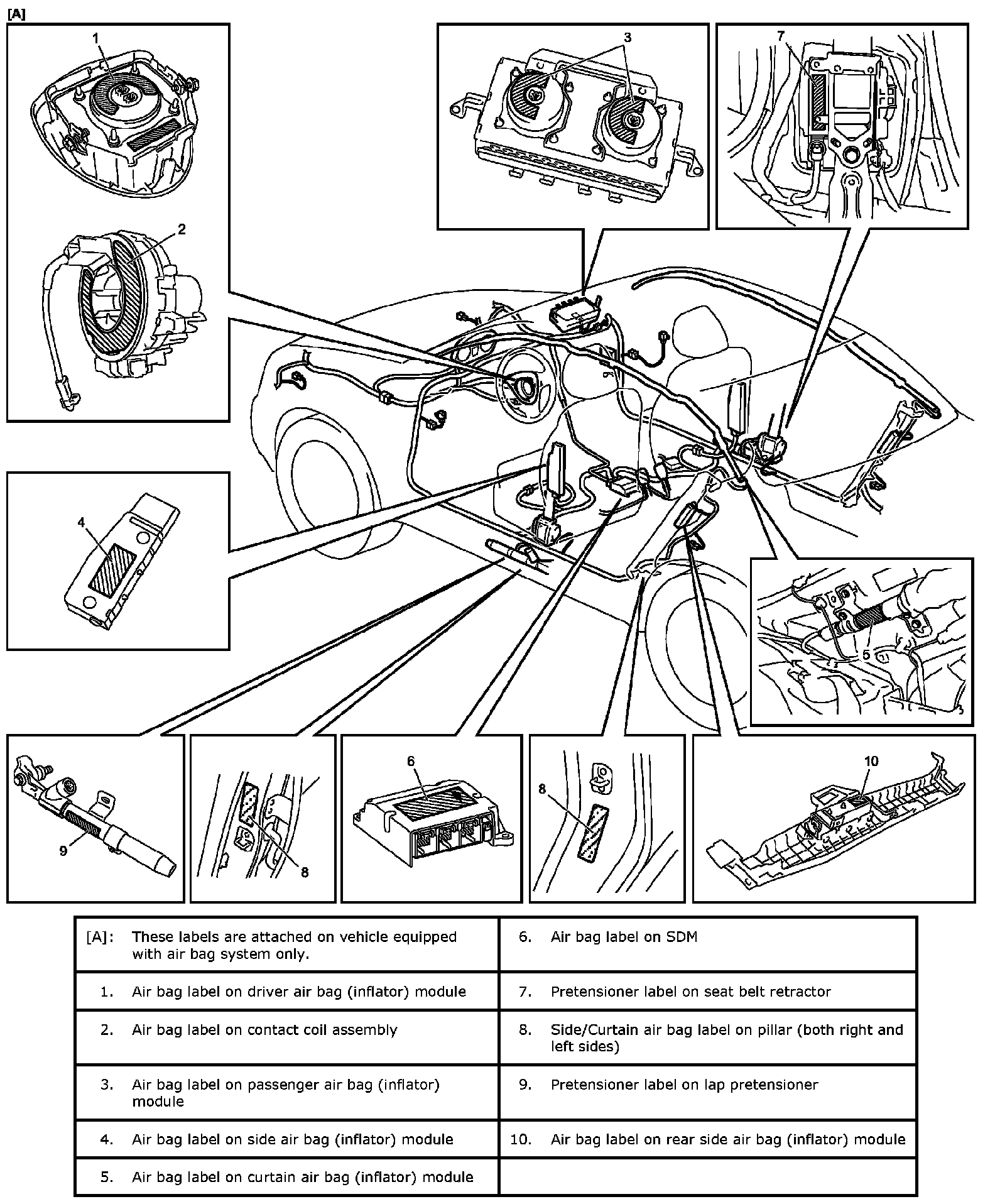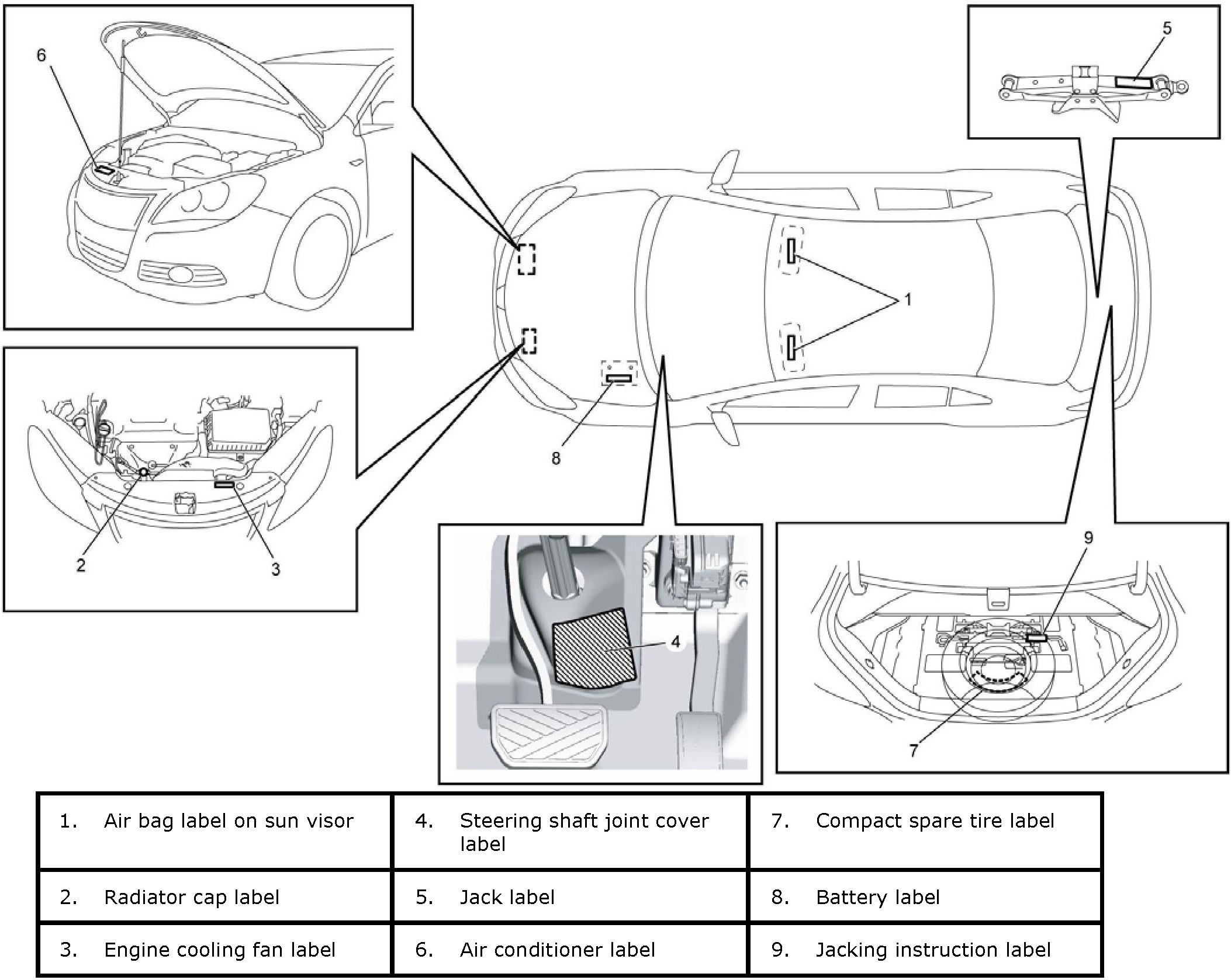 Warning, Caution And Information Labels LocationThe figure shows main labels among others that are attached to vehicle components. When servicing and handling components, refer to WARNING / CAUTION instructions printed on labels.