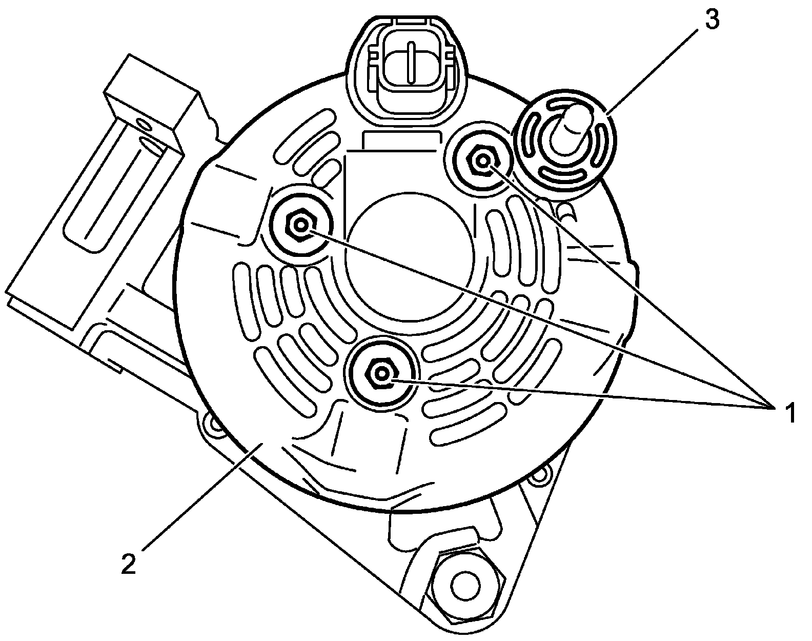 4. Loosen brush holder screws (1) and remove brush holder assembly (3) from stator assembly (2).