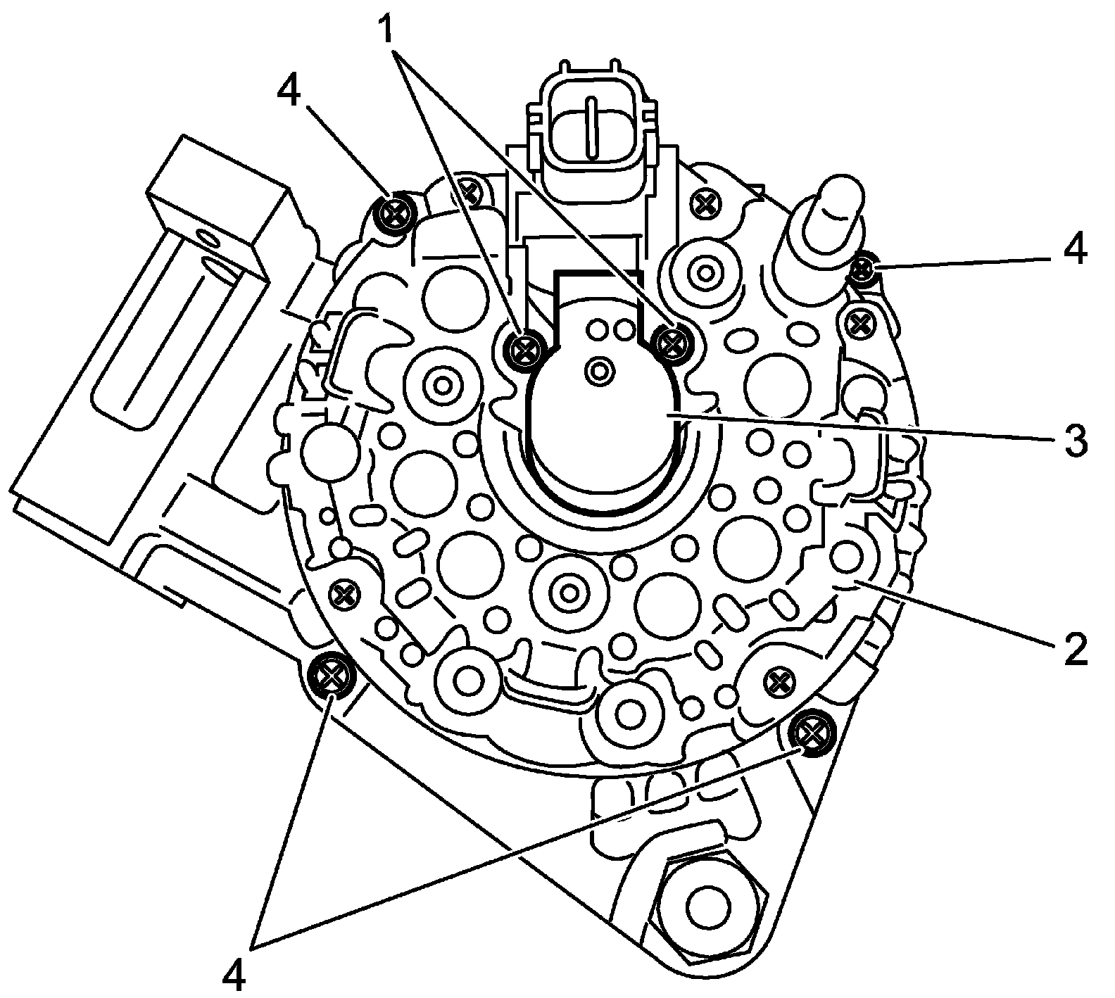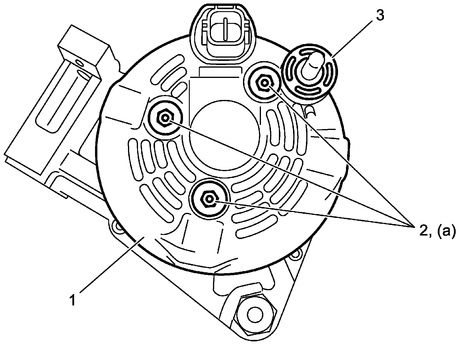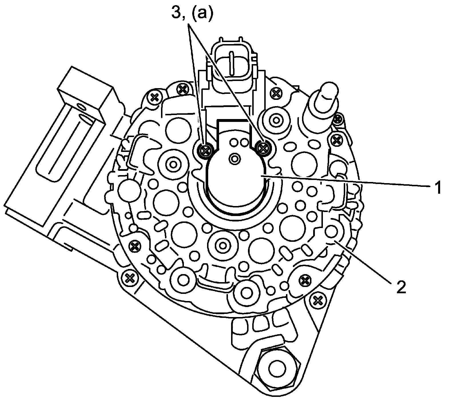 b. Install brush holder assembly (1) to stator assembly (2) and tighten brush holder screws (3) to specified torque.