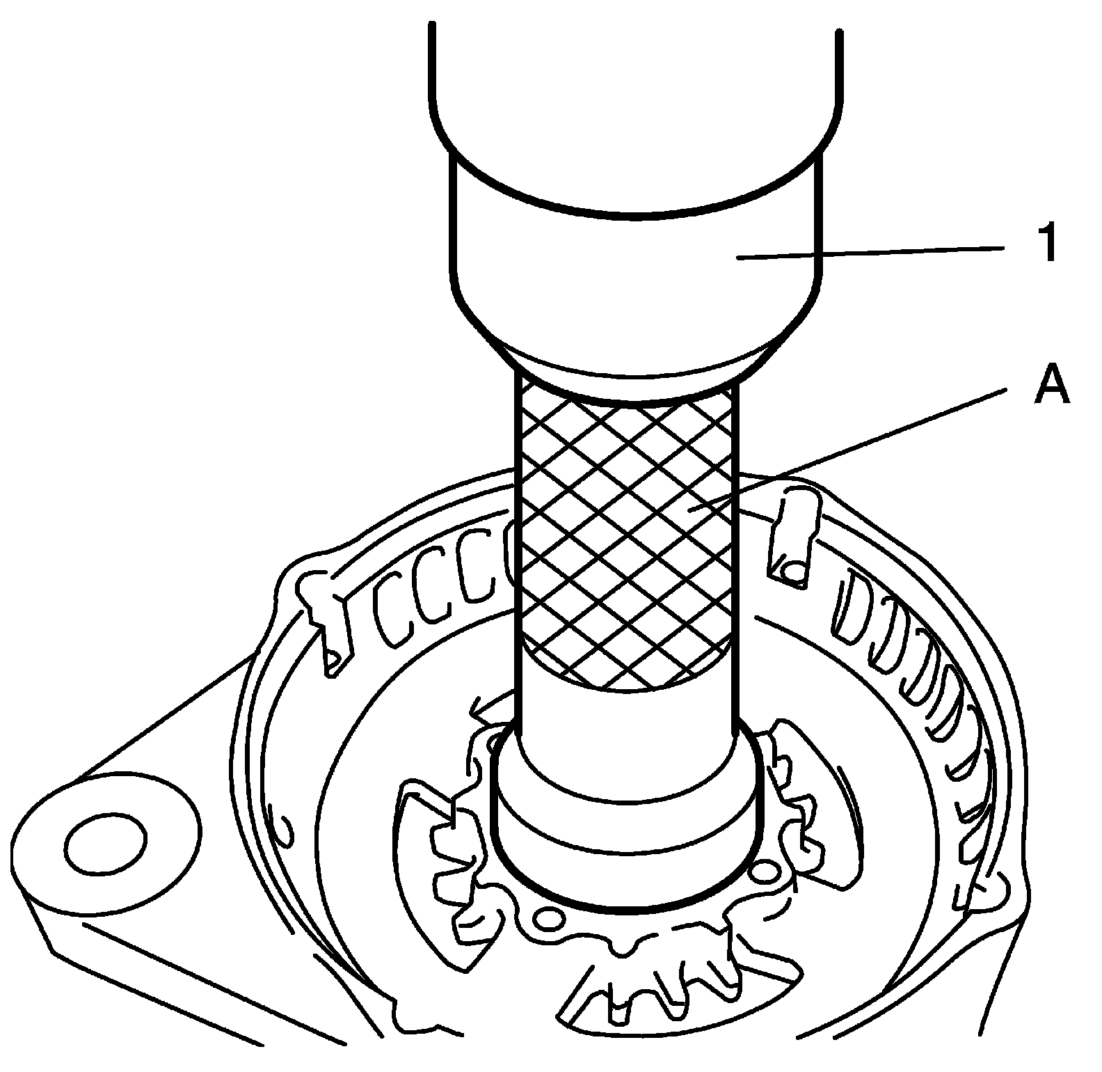 10. Push out drive end bearing by using special tool and hydraulic press (1).