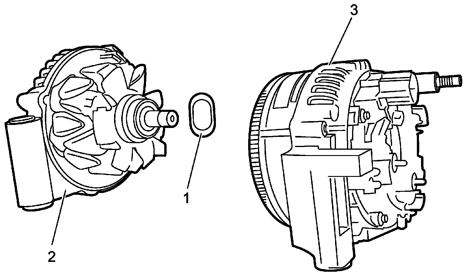 5. Install wave washer (1) and stator assembly (3) to rotor assembly (2) in alignment with matchmark drawn before disassembly.