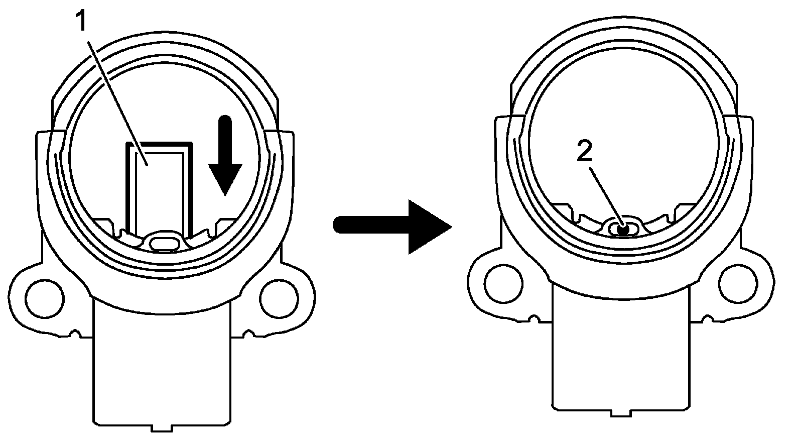 a. Depress brush (1) and install pin (2) while brush is depressed.