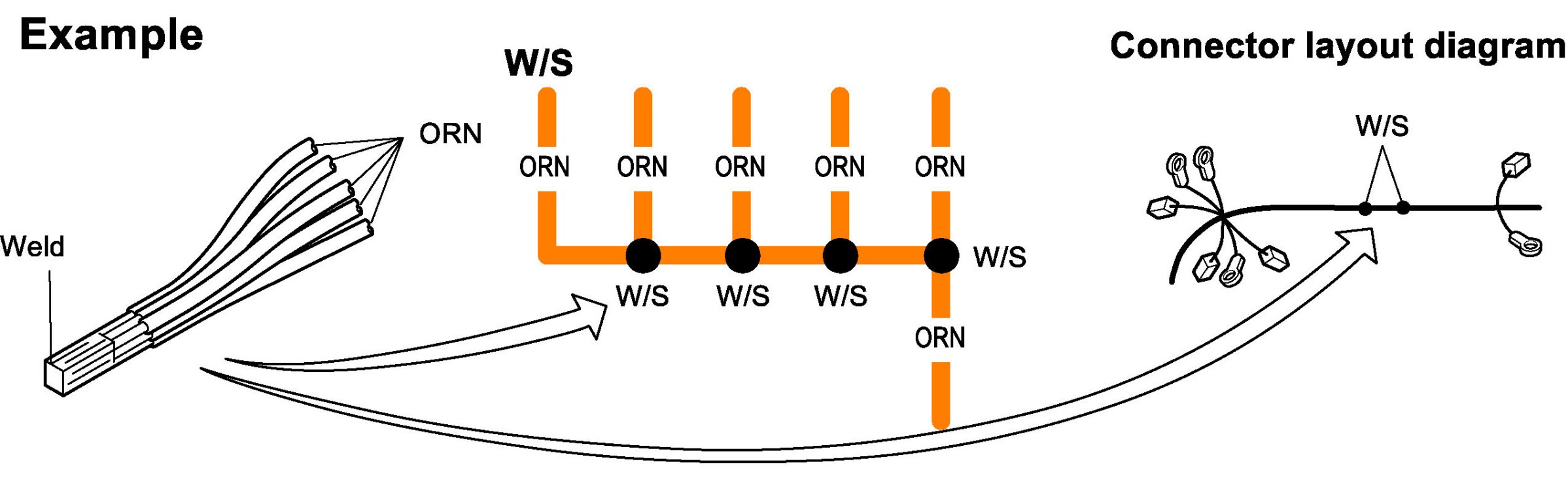 - Several different wires with the same wire color are joined by welding at a W/S.