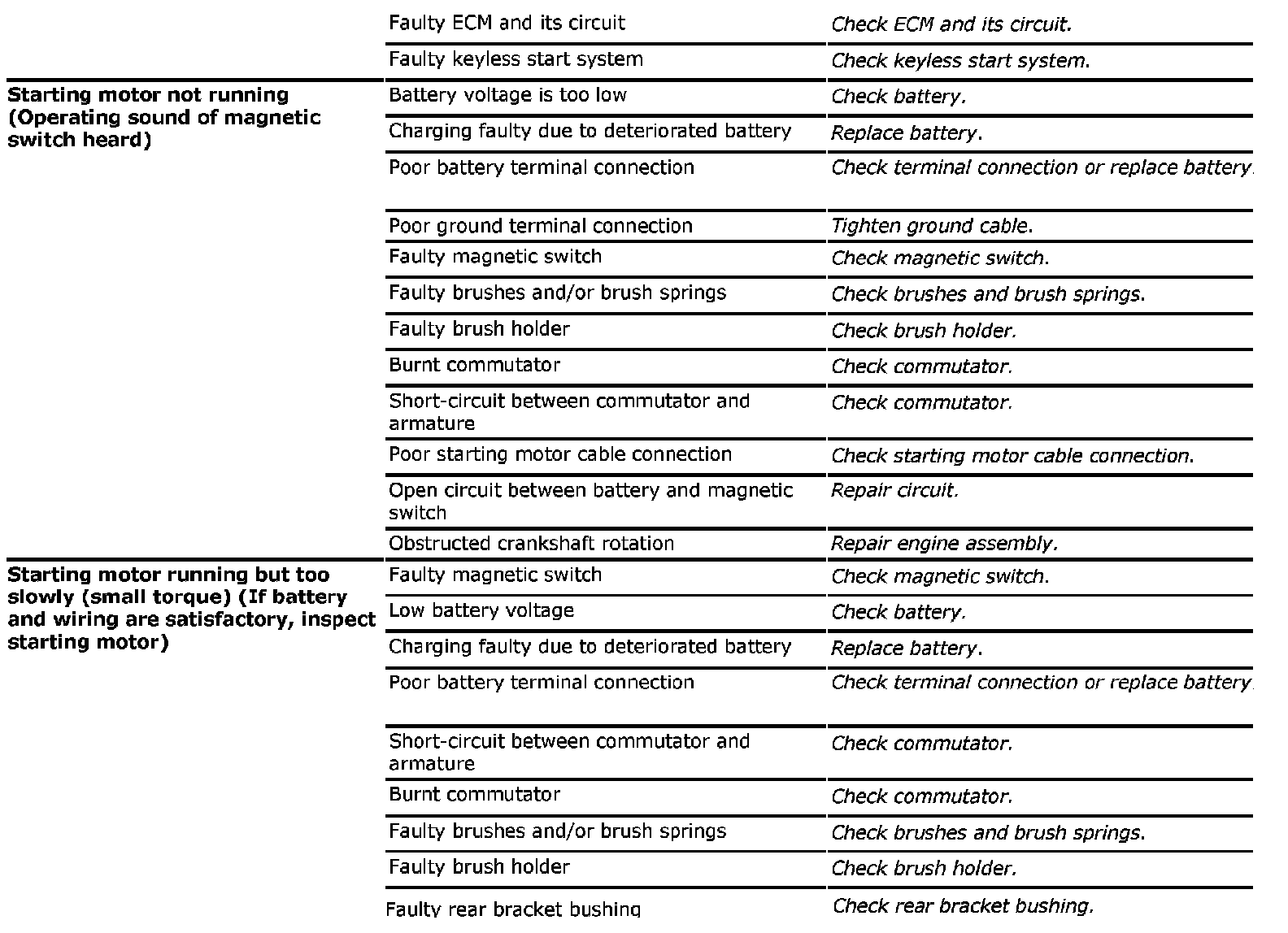 Before removing the starting motor to perform inspection, check the following items to narrow down the possible causes of trouble.