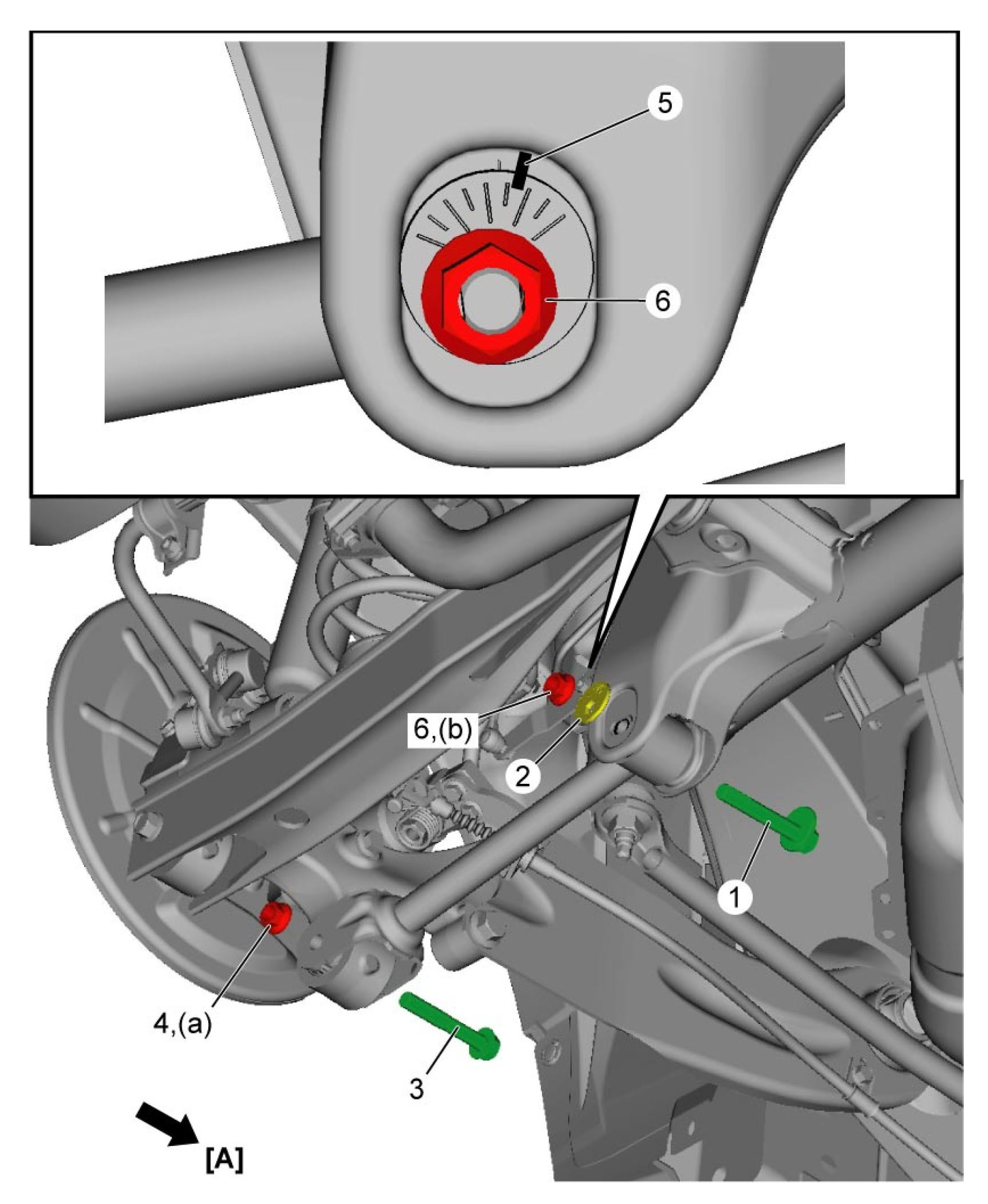 5) Align matchmark (5) on adjustment washer and rear suspension frame, then tighten new control rod lock nut (6) temporarily.