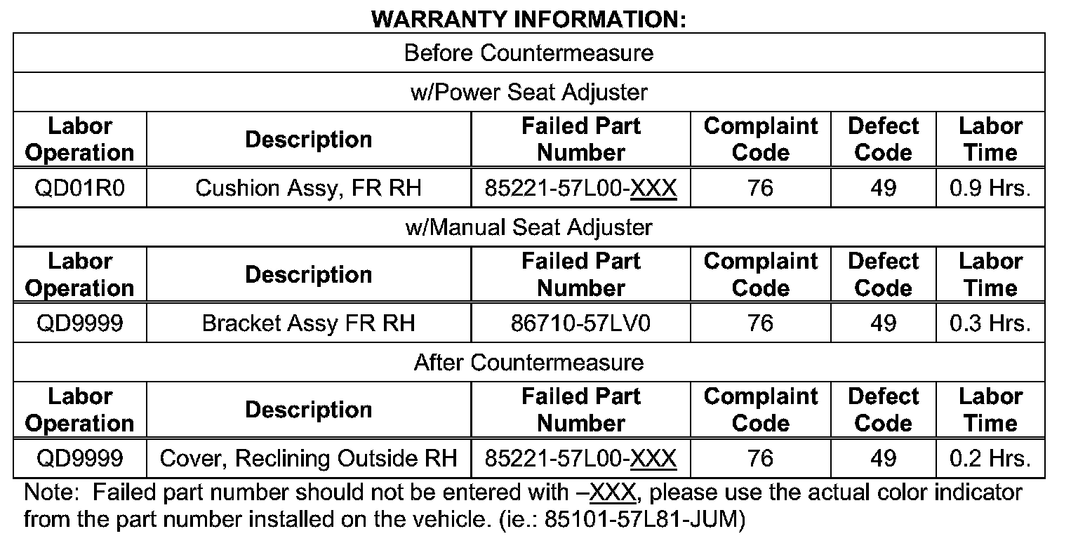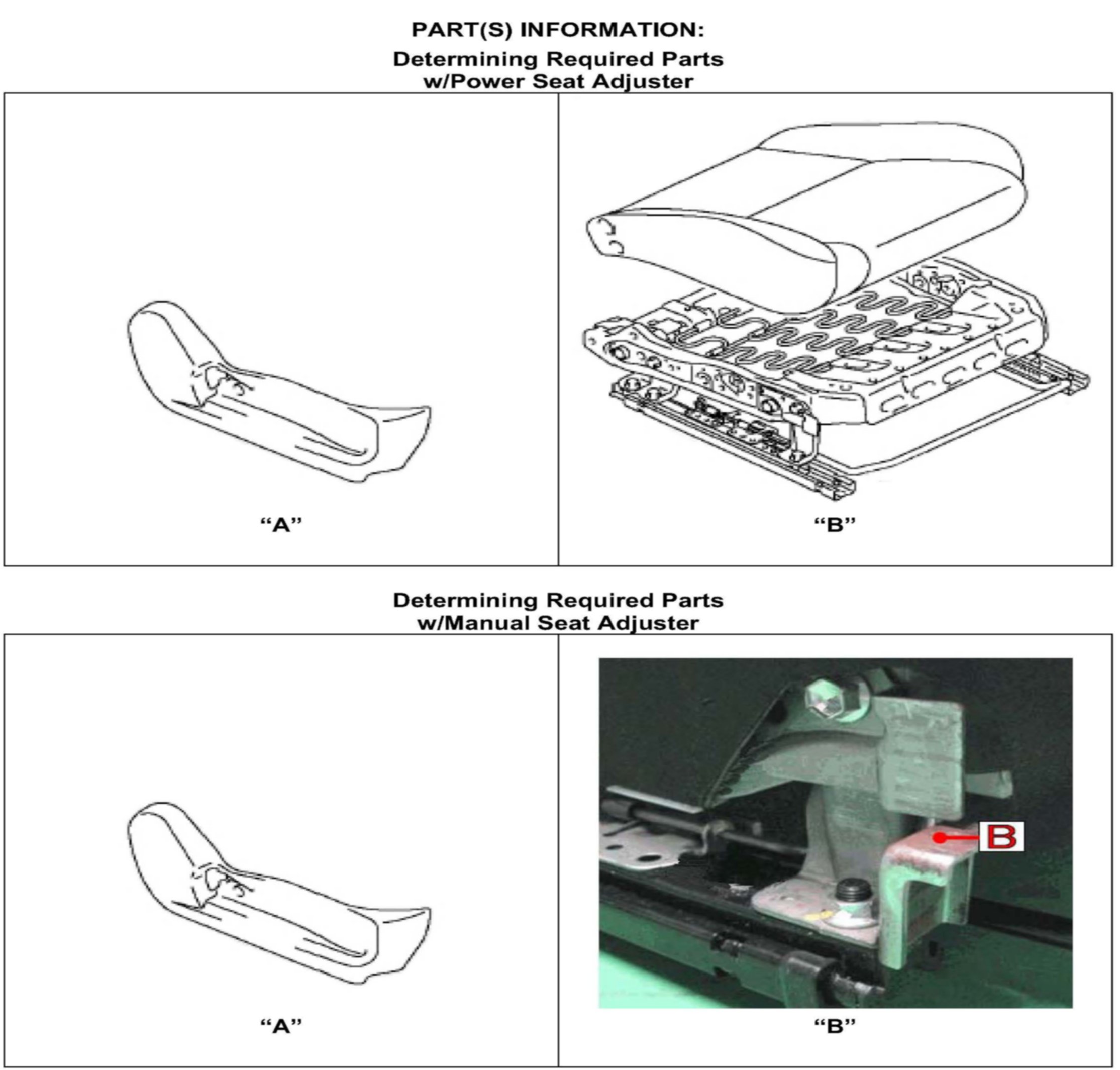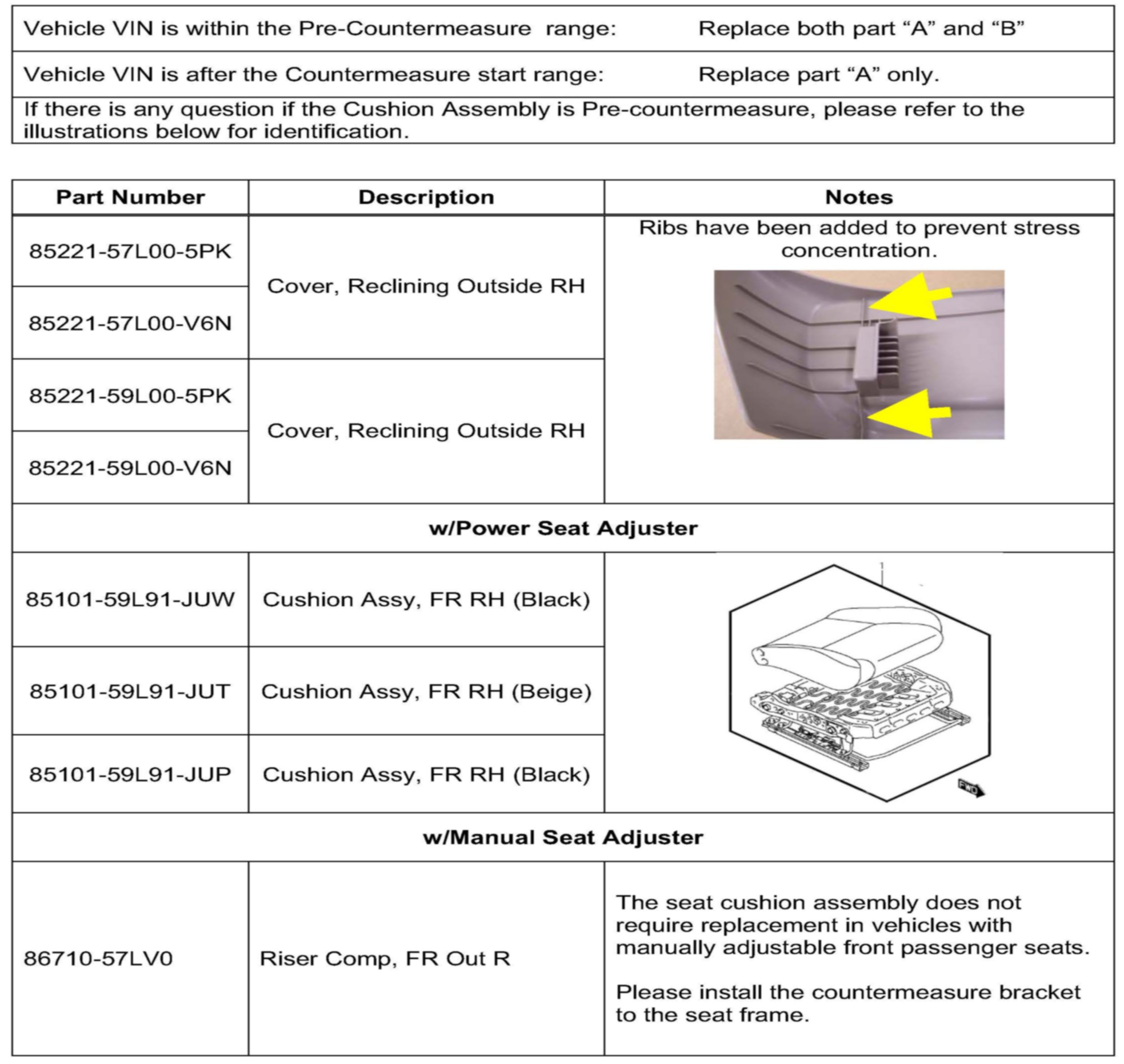 The seat frame has been modified and the trim cover redesigned to prevent stress concentration. Please refer to the countermeasure VIN breaks listed above and the seat adjuster type to determine the necessary repair action. If the vehicle you are working on was built prior to the VIN break and there is no prior replacement of the seat cushion (frame) then both the seat cushion assy must be modified (manual adjuster) or replaced (power seat) and the broken plastic trim cover must be replaced. If the vehicle is after the VIN break only the plastic trim outer reclining cover should be replaced. In the unlikely event that you encounter a vehicle that has failed after the VIN break or had a new seat cushion/frame modified or replaced, and find that the seat cushion (frame) is the same as that pictured as "Before" countermeasure, contact the Suzuki Technical Hotline for instructions.