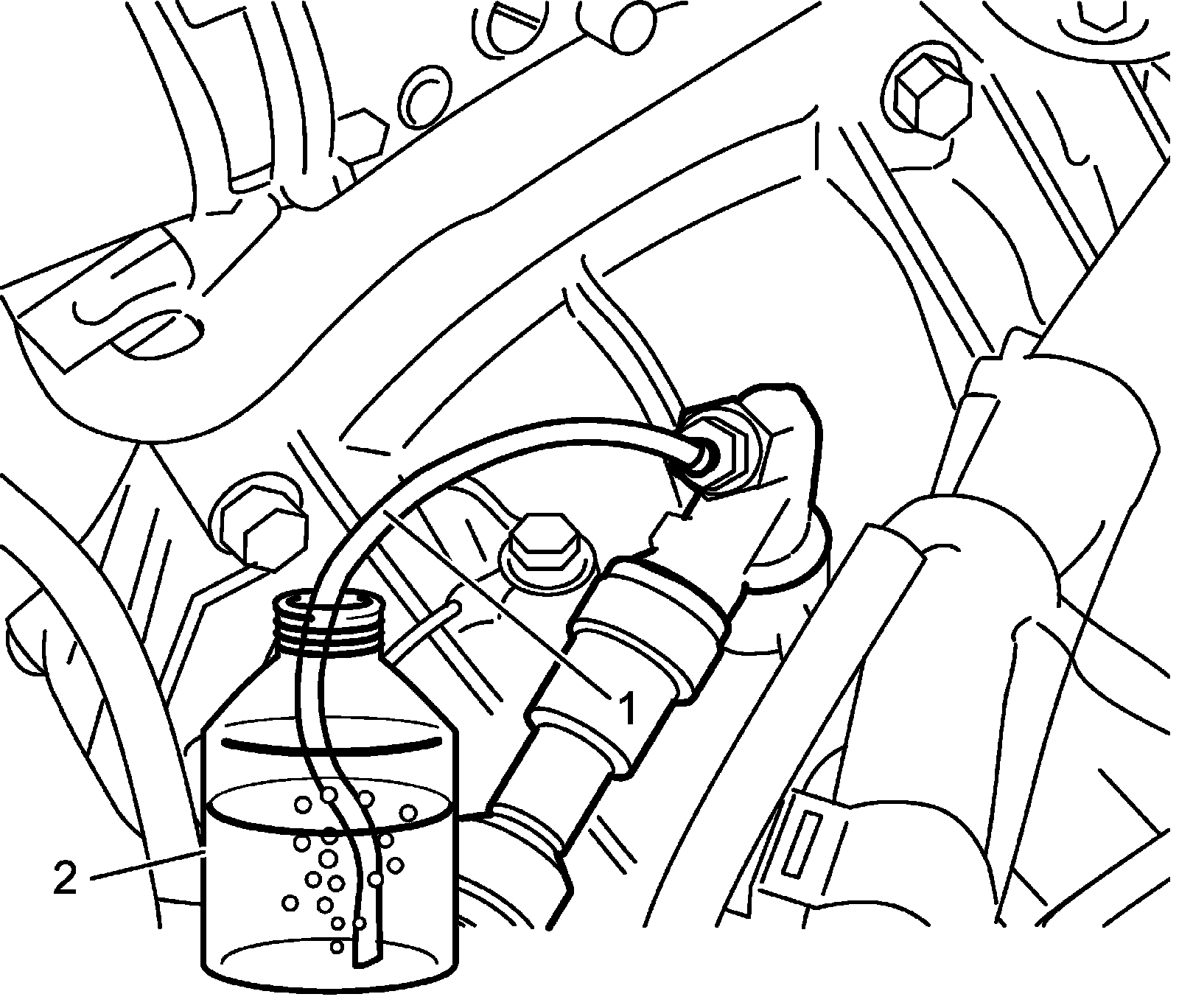 2) Remove bleeder plug cap. Attach a vinyl tube (1) to bleeder plug, and insert the other end into container (2).