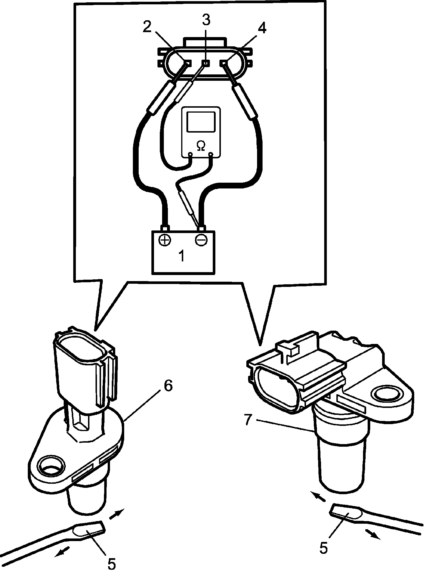 a) Arrange 12 V battery (1) and connect its positive terminal to terminal "2" (2) and negative terminal to terminal "4" (4) of primary pulley speed sensor connector or secondary pulley speed sensor connector.