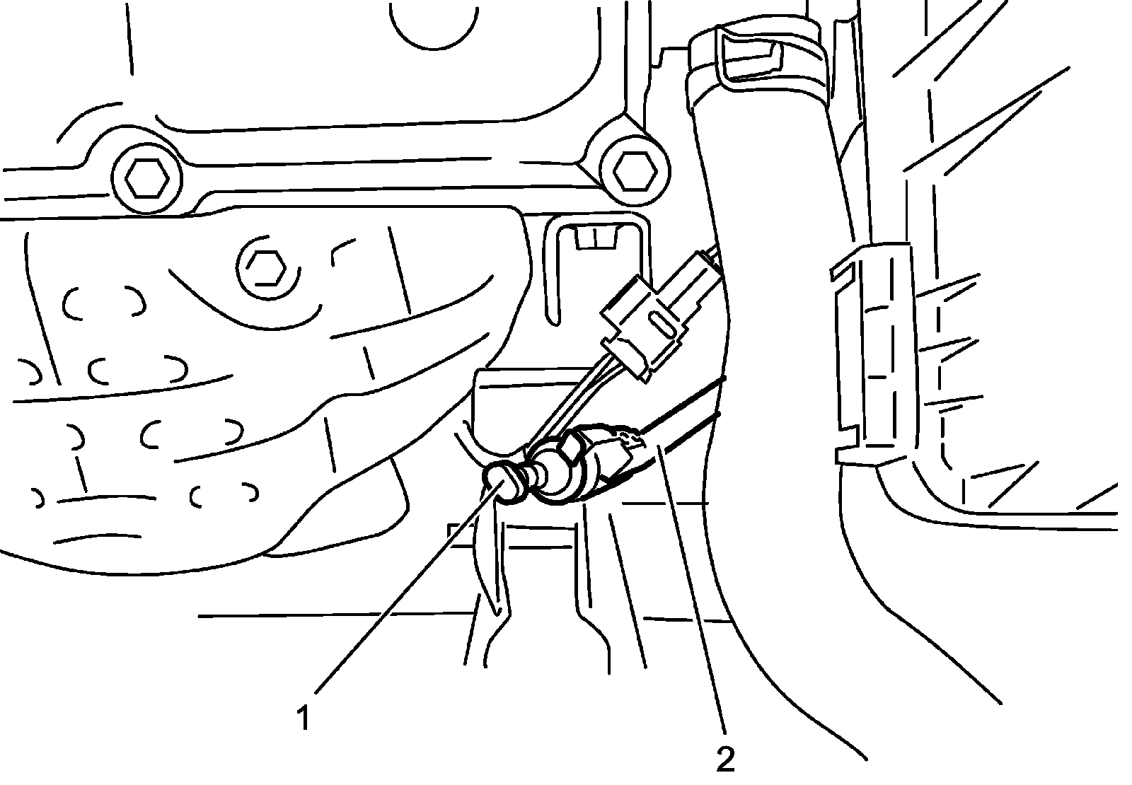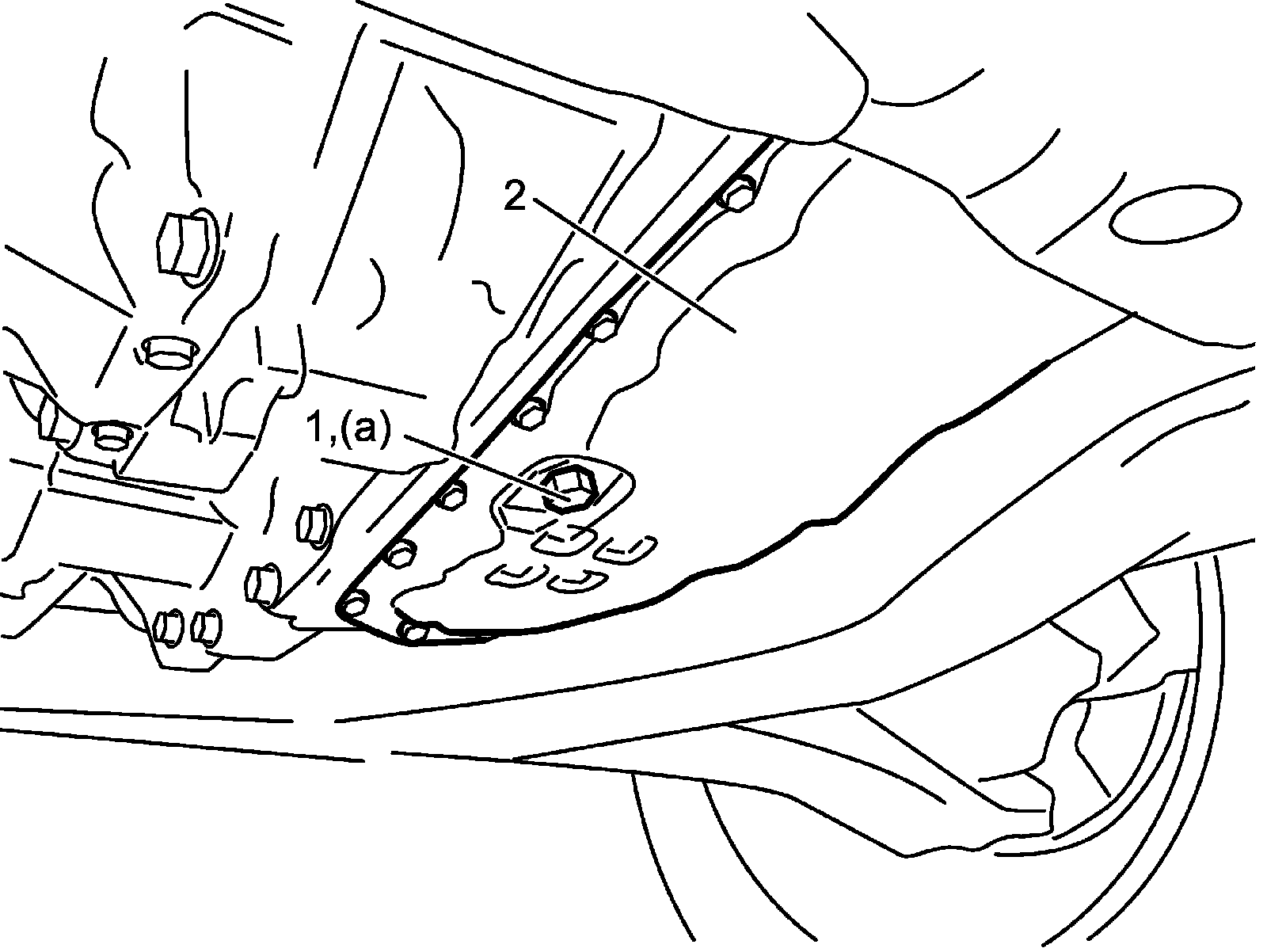 3) When engine is cool, remove CVT fluid drain plug (1) from CVT oil pan (2) and drain CVT fluid.