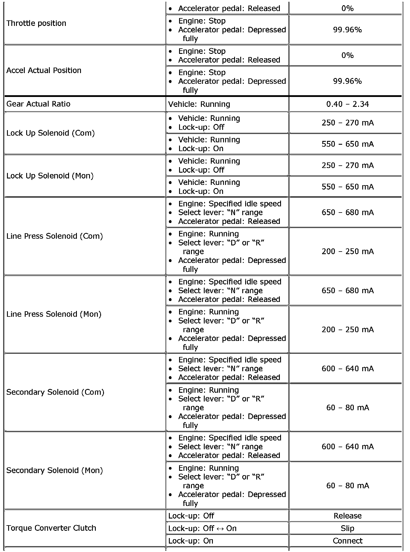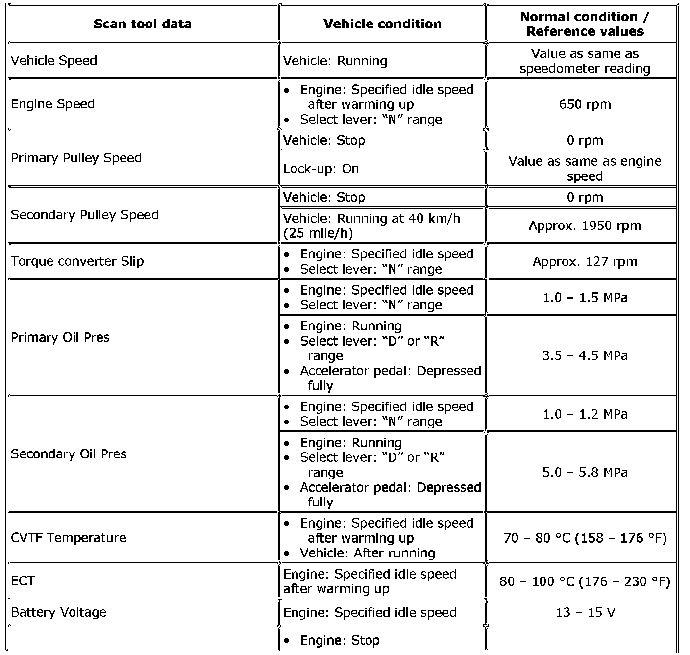 Also, condition in the following table that can be checked by the scan tool are those detected by TCM and output from TCM as commands and there may be cases where the CVT or actuator is not operating (in the condition) as indicated by the scan tool.