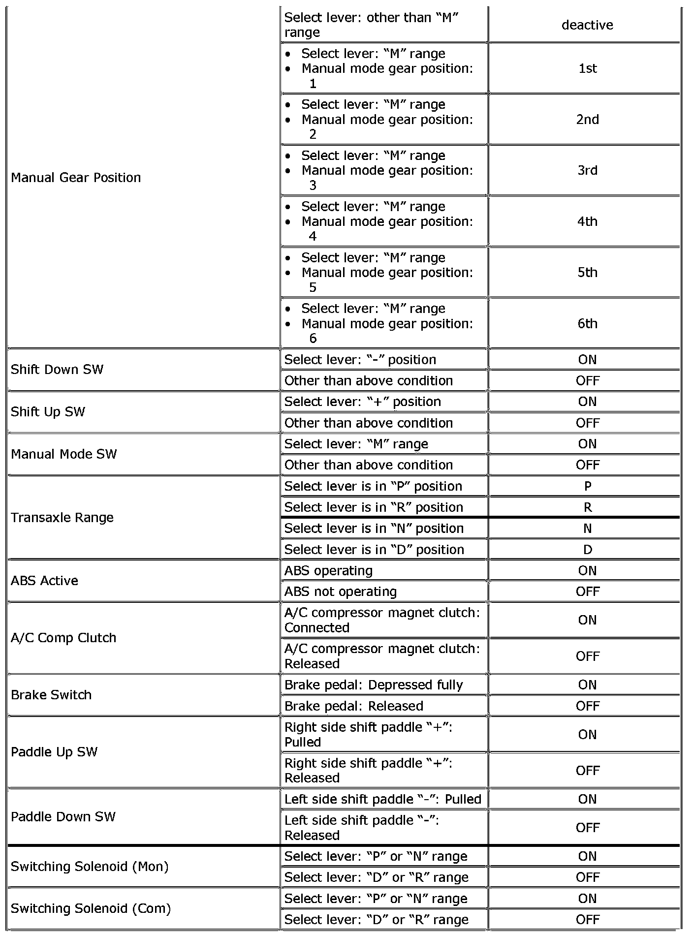 This parameter indicates the output state of TCM to lock-up / select switching solenoid valve.