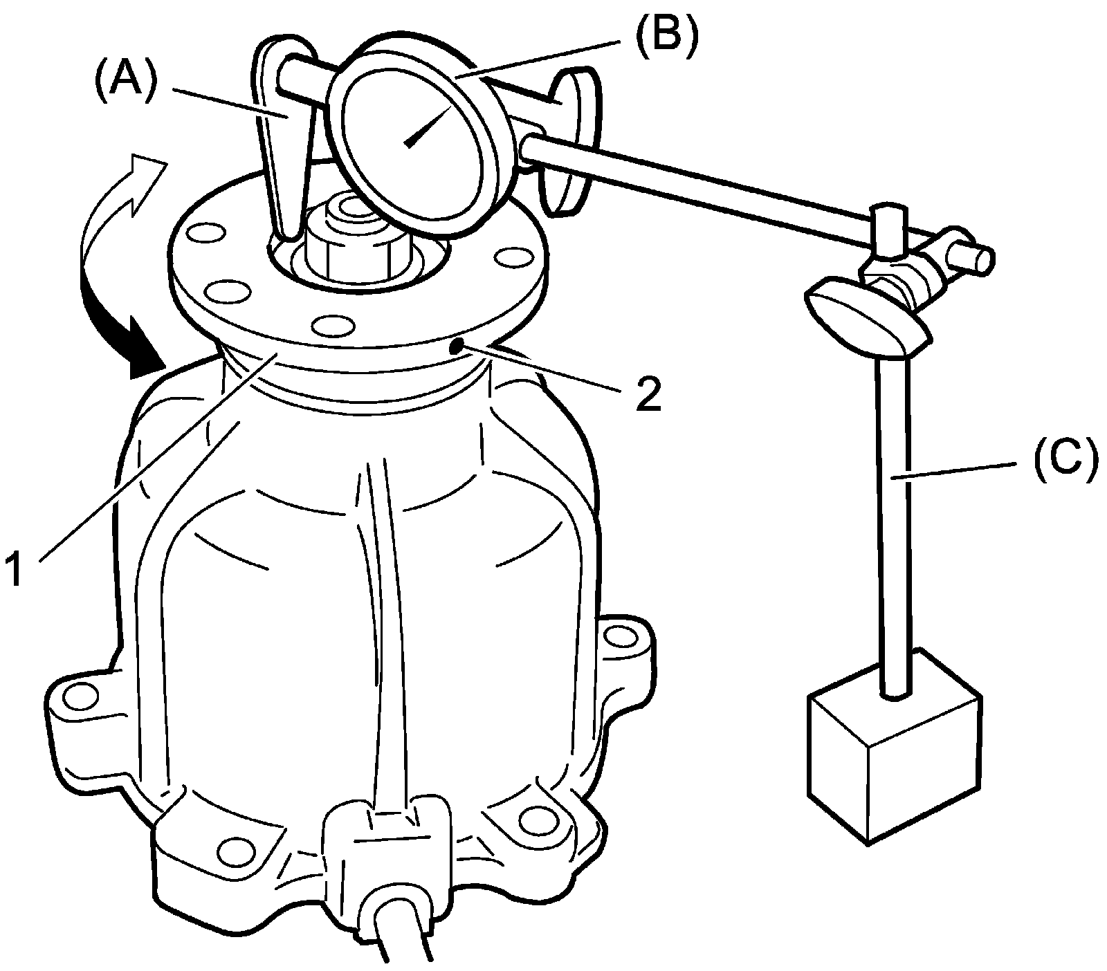2) Use special tools and dial gauge to measure runout of companion flange (1) inside diameter. Mark (2) on companion flange outside diameter where runout is minimum value. If measurement exceeds runout limit, replace companion flange with new one and measure runout again.
