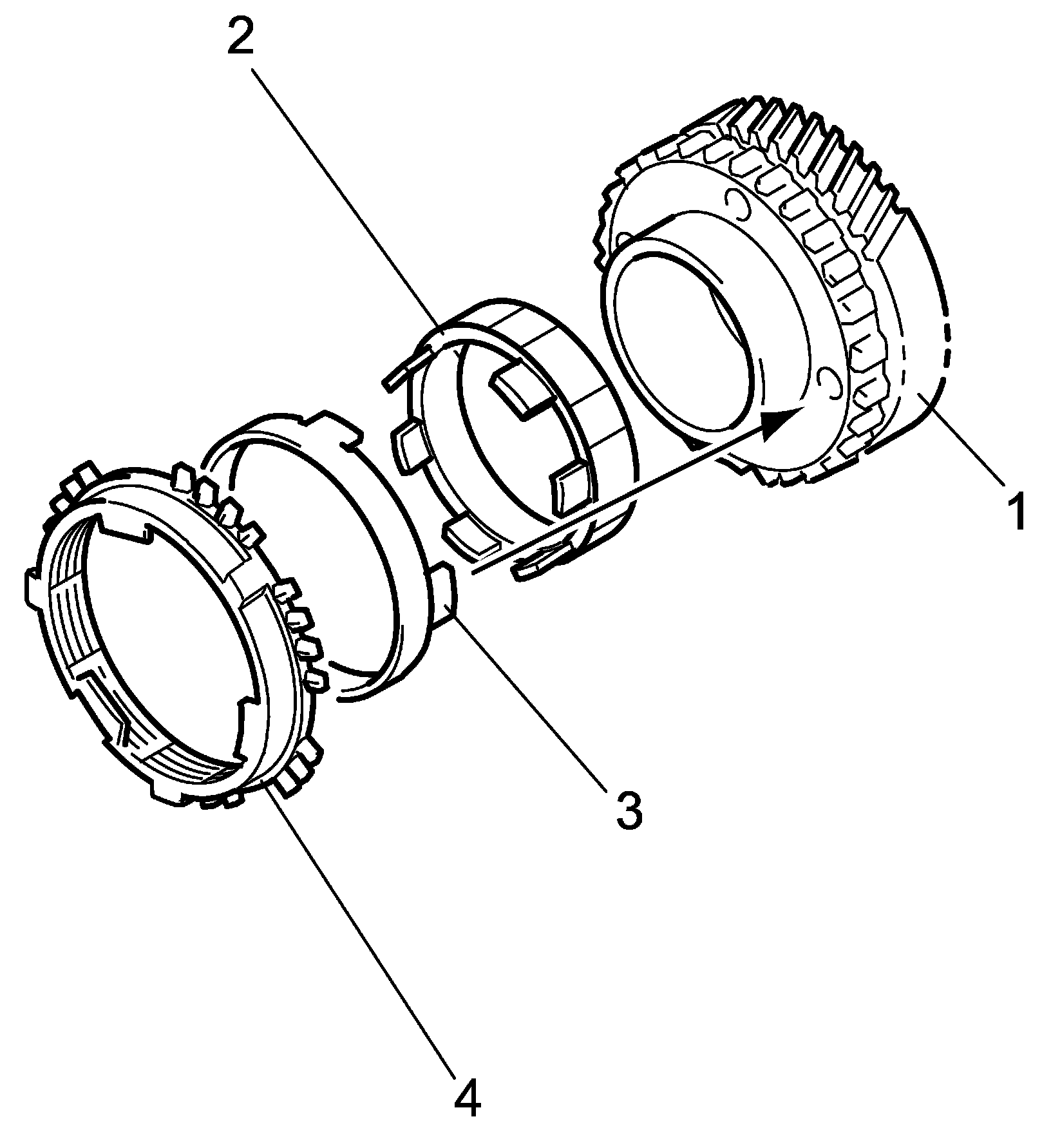 3) Install 3rd gear needle bearing and apply transaxle oil to it, and then install 3rd gear synchronizer inner ring (2), 3rd gear synchronizer center cone (3), 3rd gear synchronizer outer ring (4) and 3rd gear (1) to input shaft.