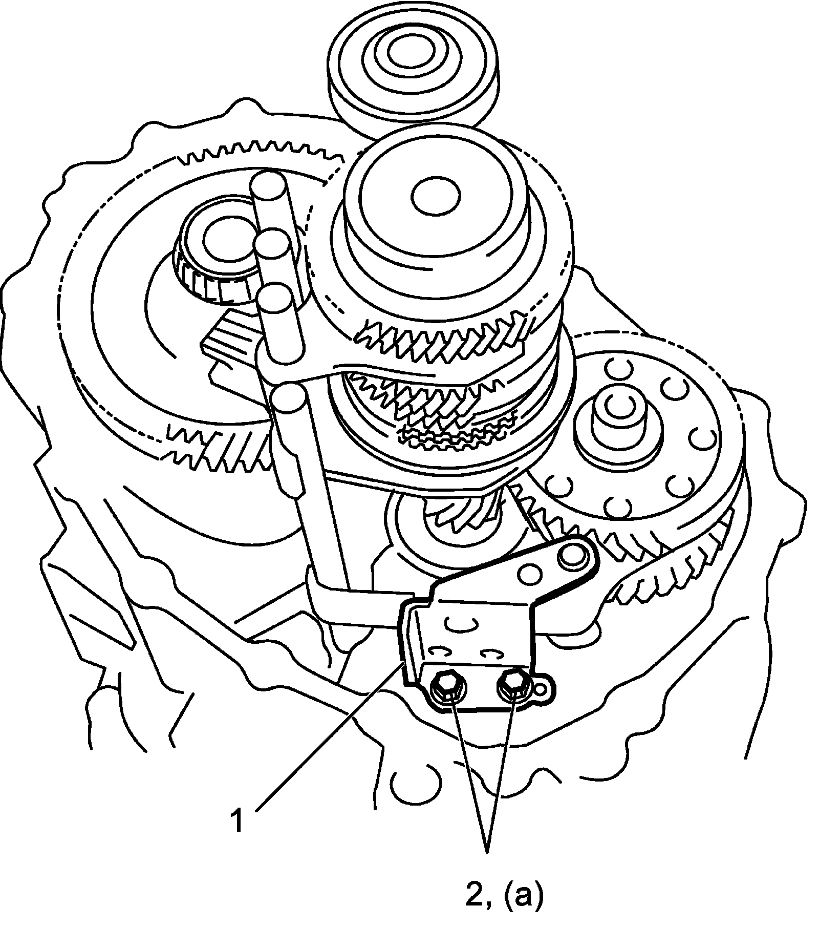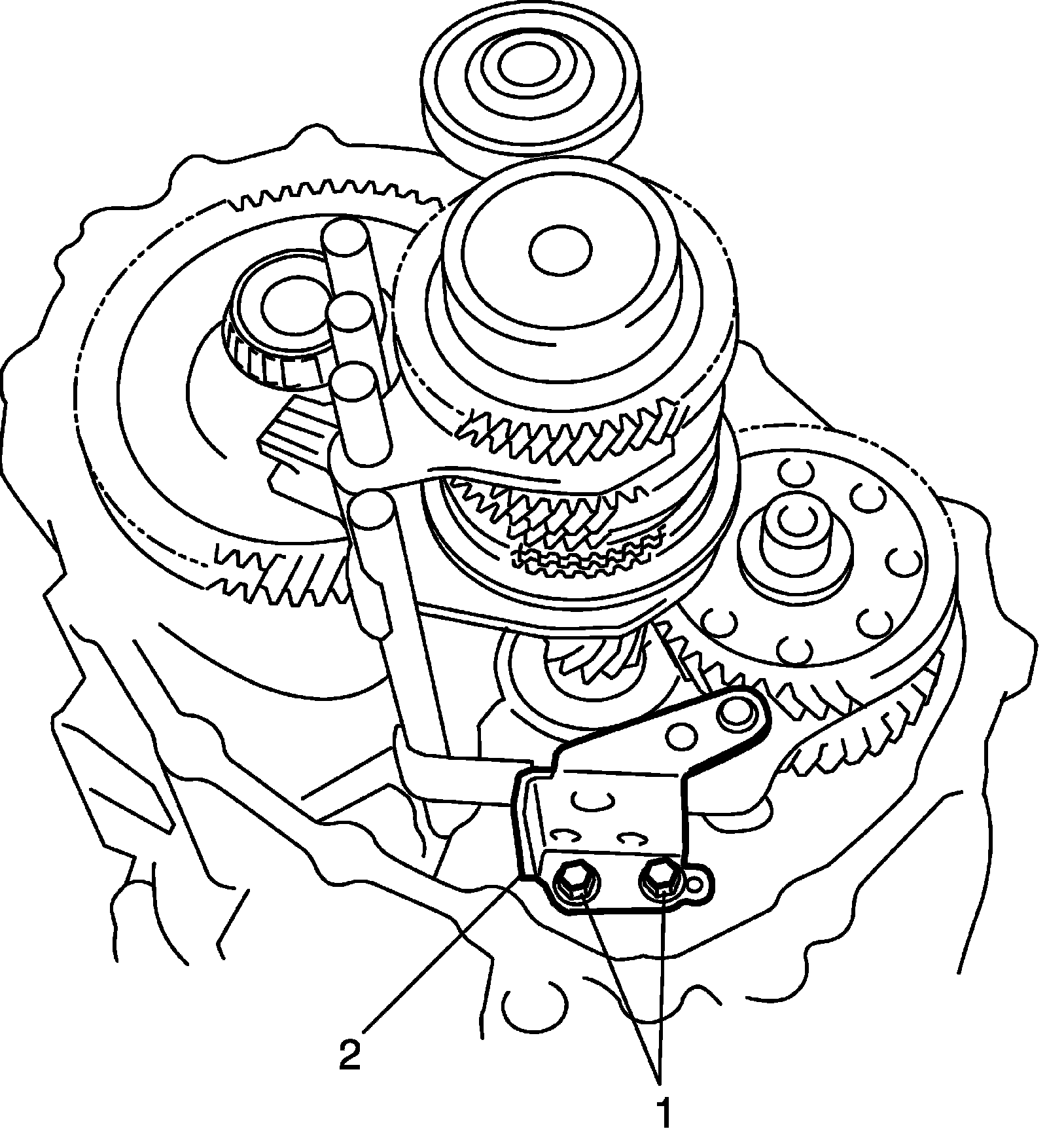 5) Install reverse gear shift lever (1) and then tighten new reverse gear shift lever bolts (2) to specified torque.