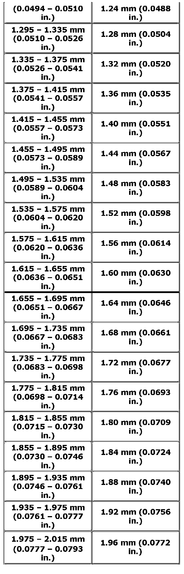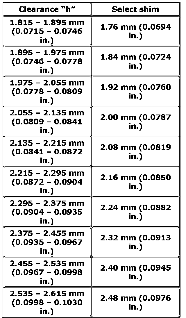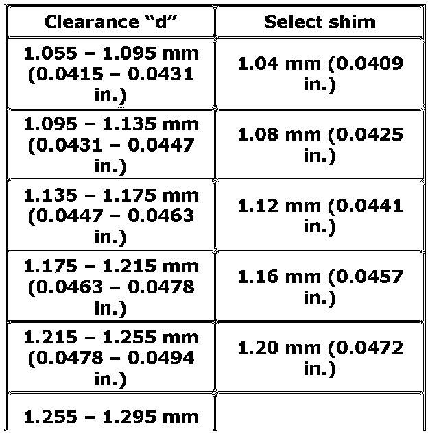 d) Select shims closest to clearance "d" and "h" from among the following available sizes.