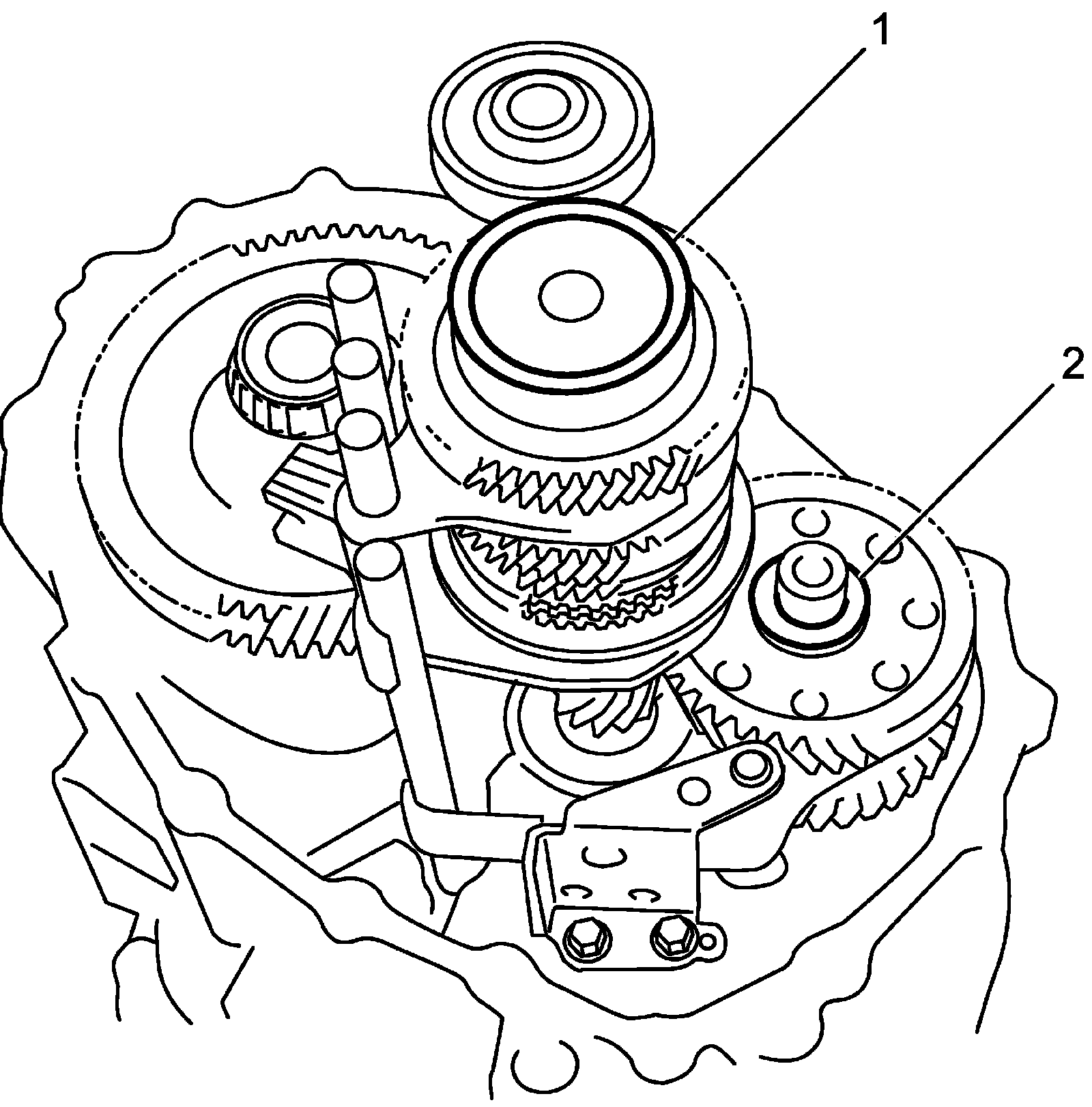 4) Remove reverse gear shift lever bolts (1) and reverse gear shift lever (2).