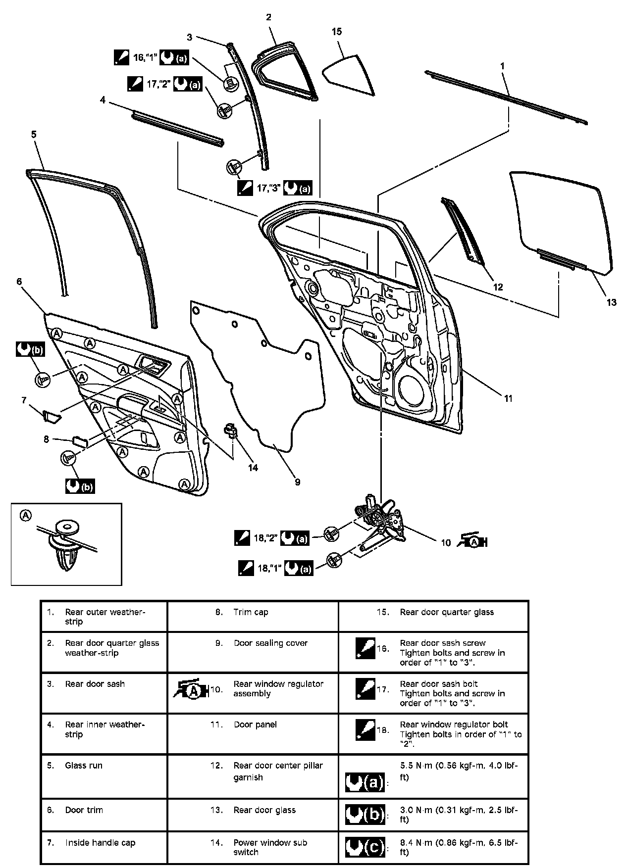 Rear door sash bolt (a): 5.5 N.m (0.56 kg-m, 4.0 lbf-ft)