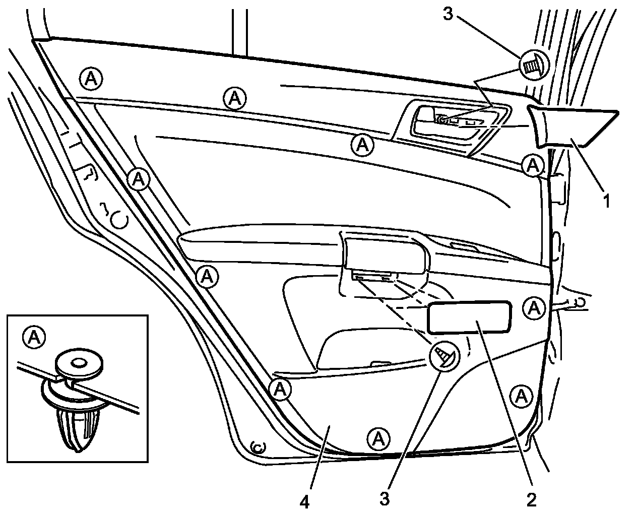 3. Remove screws (3), clips, and then remove door trim (4) by pulling it, and then disconnect connectors of door harness.