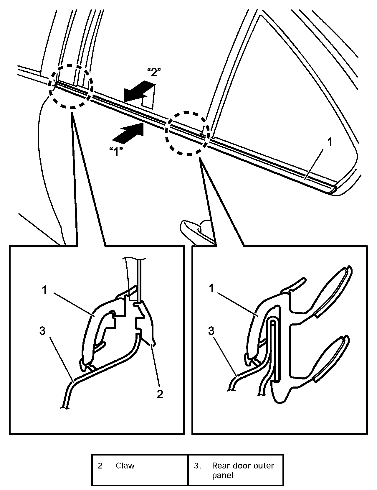 4. Lower rear door glass fully, and then remove rear outer weather-strip (1) by moving it in arrow directions in order ("1" to "2") as shown in figure.