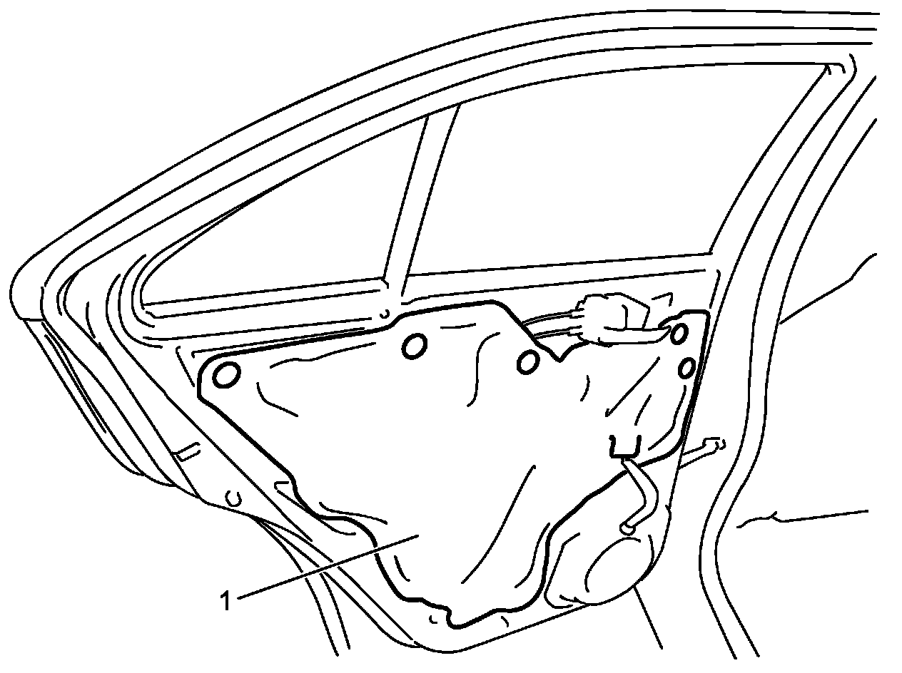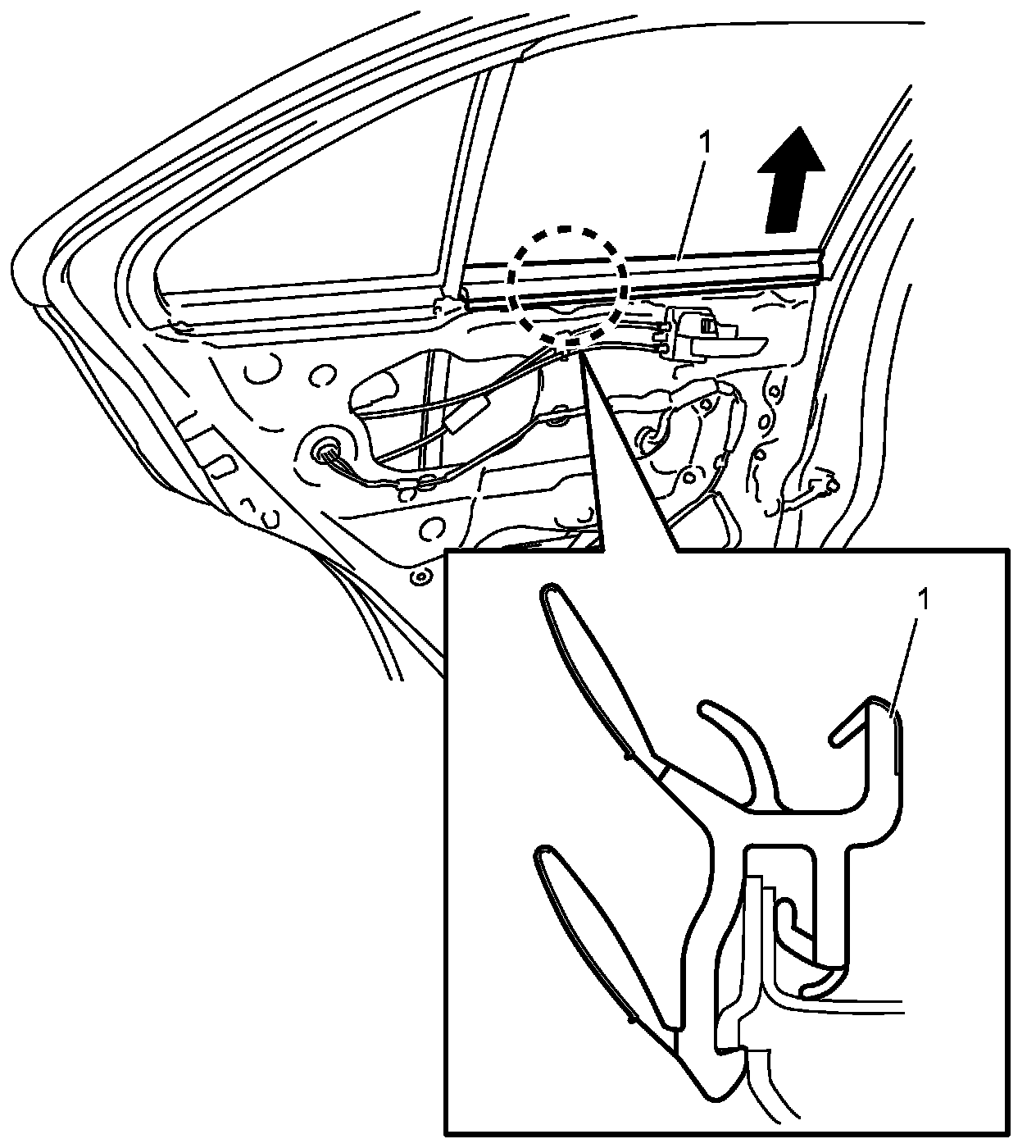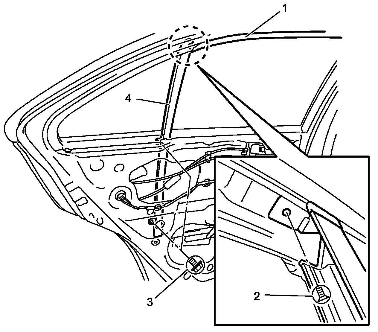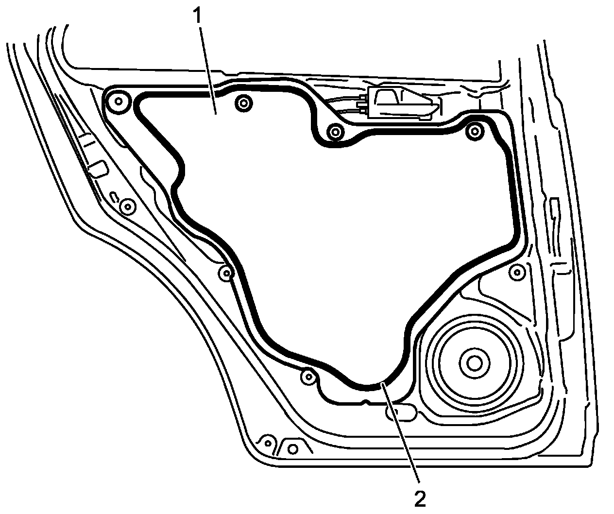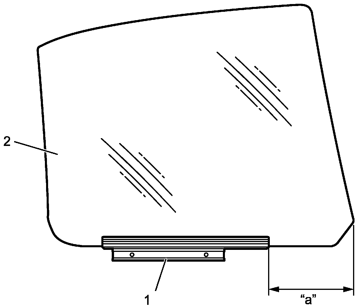 - Install glass bottom channel (1) to specified position of rear door glass (2) if it is removed from rear door glass.