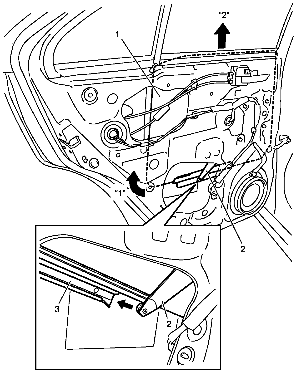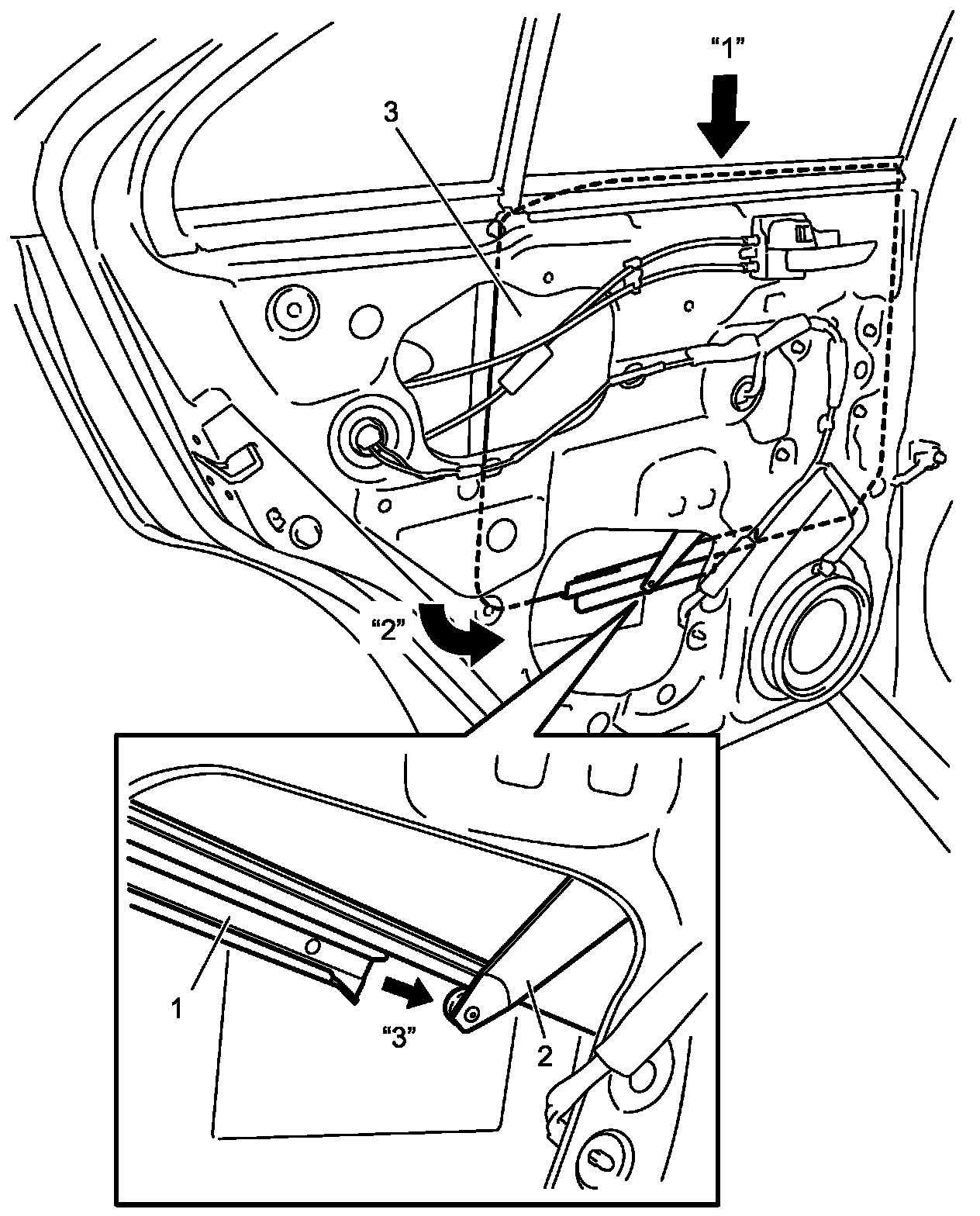 - Insert rear door glass (3) in direction of arrow "1" and turn in direction of arrow "2" to move glass bottom channel (1) in direction of arrow "3" and fit to rear window regulator assembly (2).