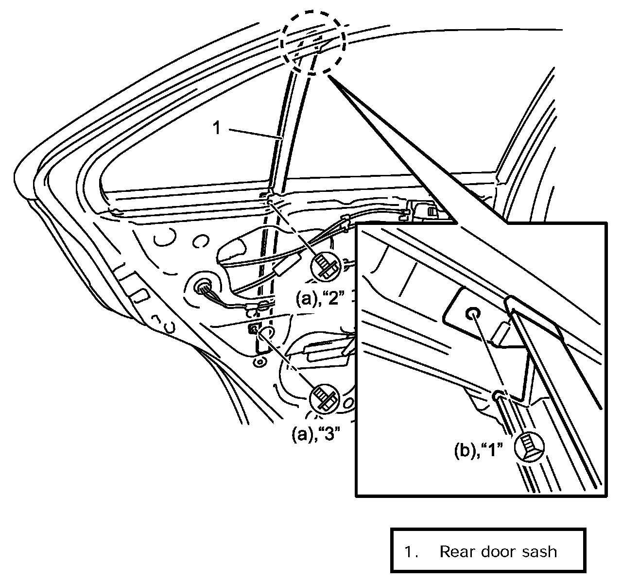 - Tighten rear door sash screw and rear door sash bolts in order of "1" to "3" to specified torques.
