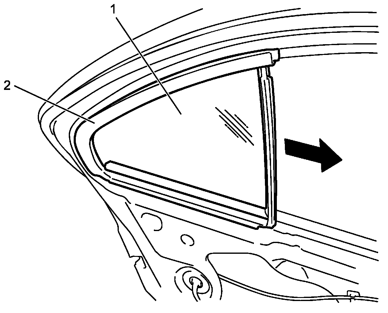 2. Pull to remove rear door quarter glass (1) and rear door quarter glass weather-strip (2) in arrow direction.
