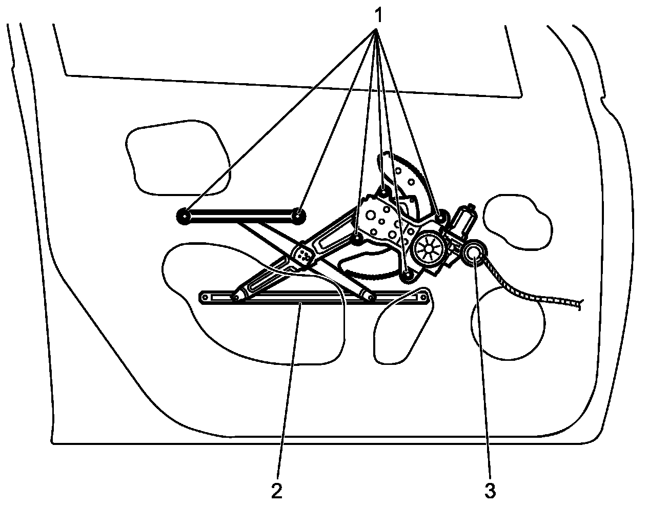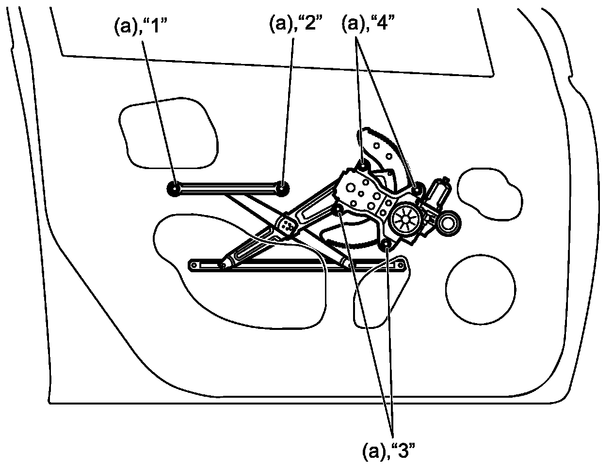 - Tighten front window regulator bolts in order ("1" to "4") to specified torque.