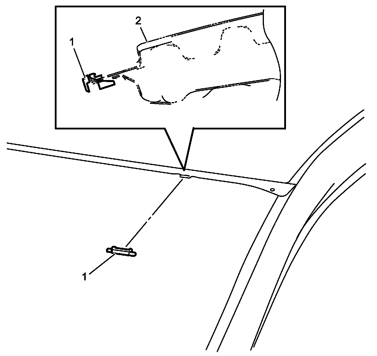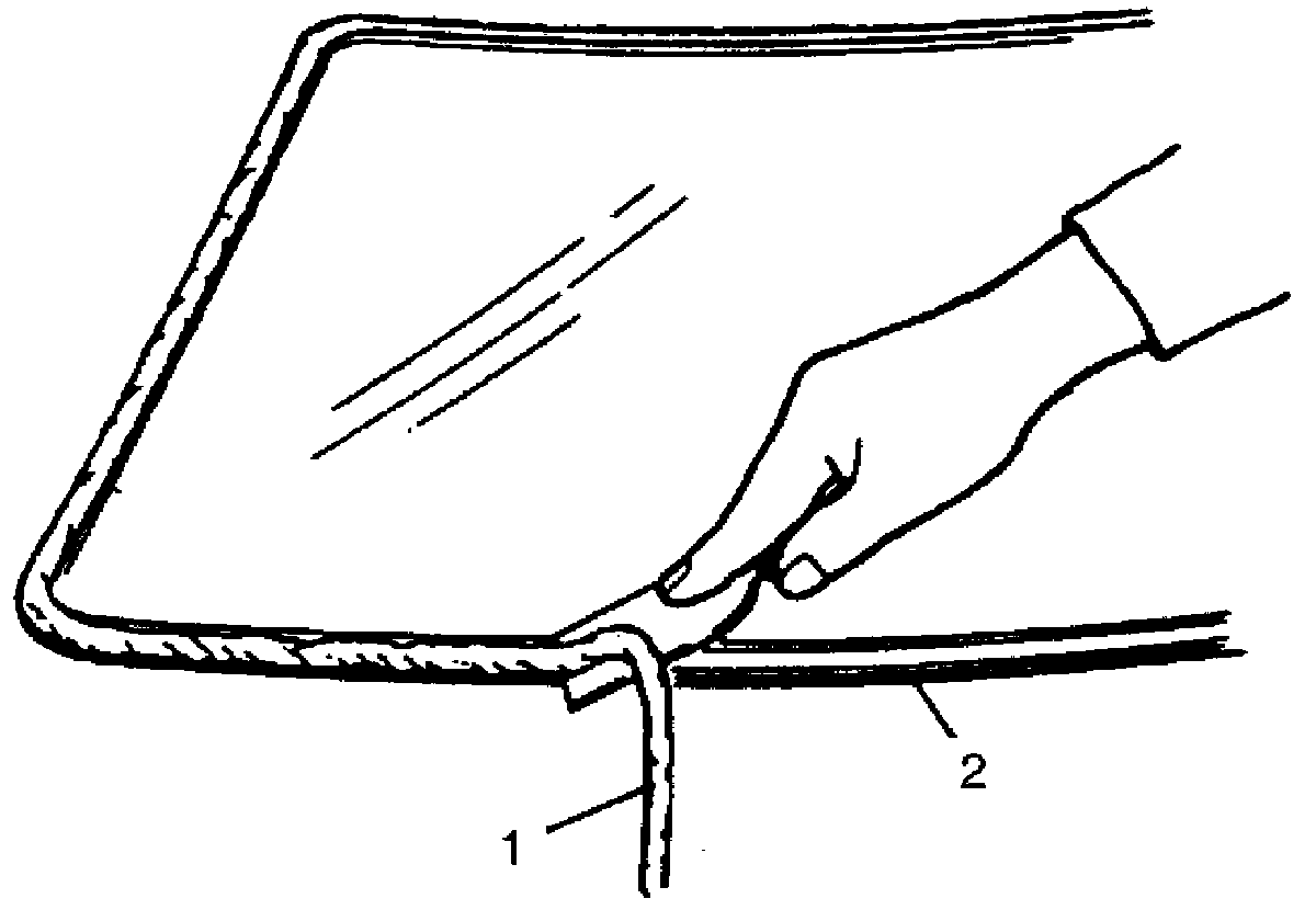 NOTE: If windshield is to be reused, be careful to remove adhesive (1) not to damage primer application surface (2).