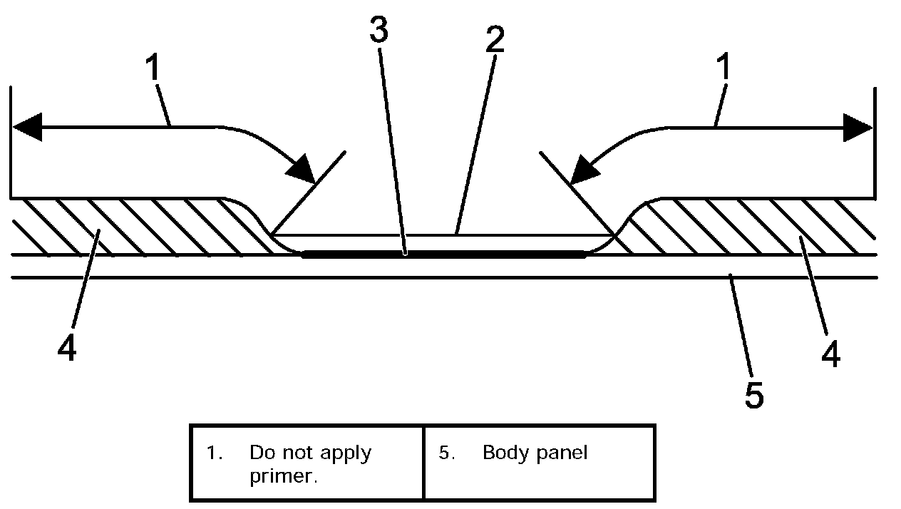 3. Clean contact surfaces of old adhesive (4) left on body. Apply primer (2) where paint or bare metal is exposed (3).