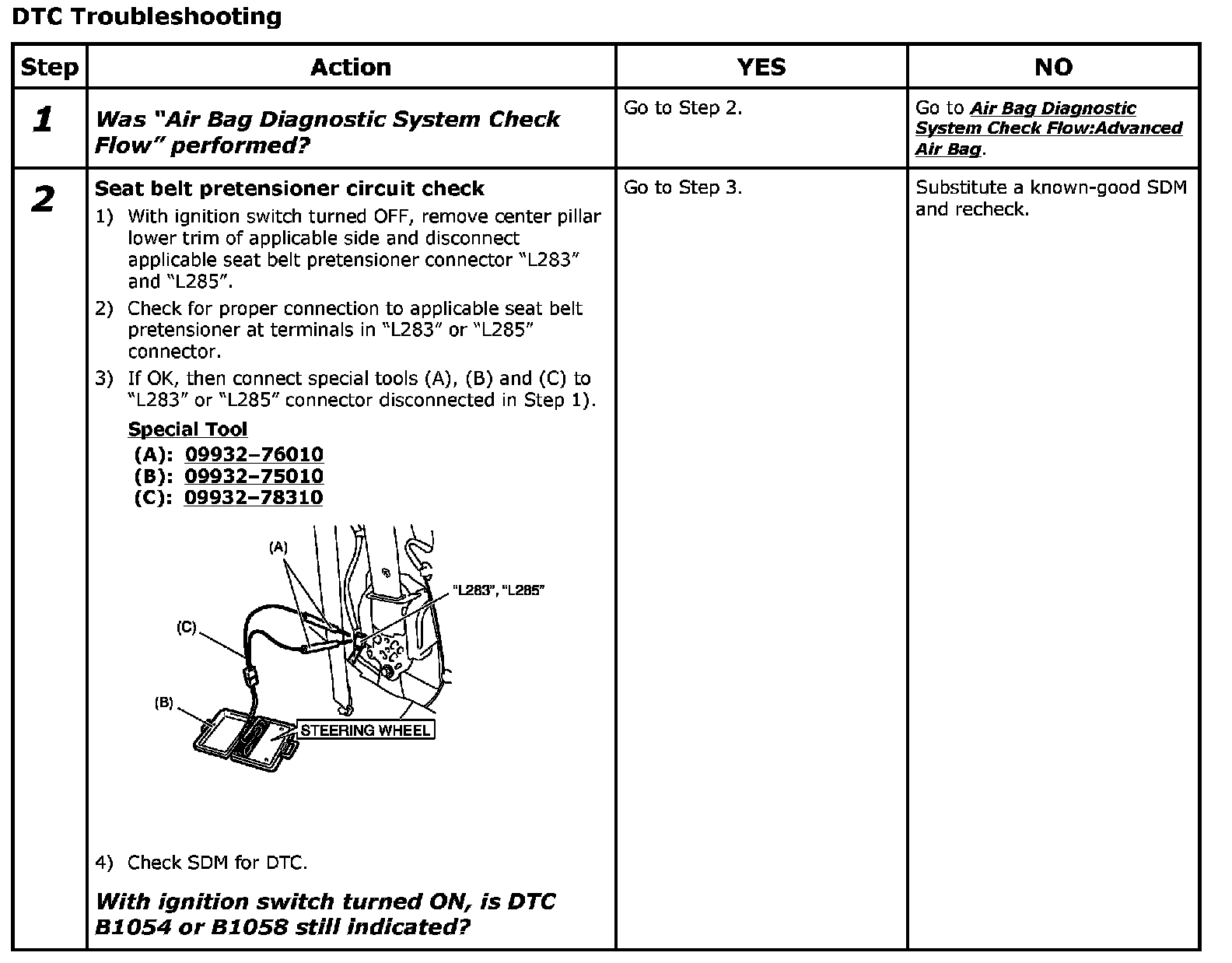 DTC B1054 / B1058: Seat Belt Pretensioner Circuit Shorted to Power Supply(DTC B1054: Driver Seat Belt Pretensioner Circuit Shorted to Power Supply)
