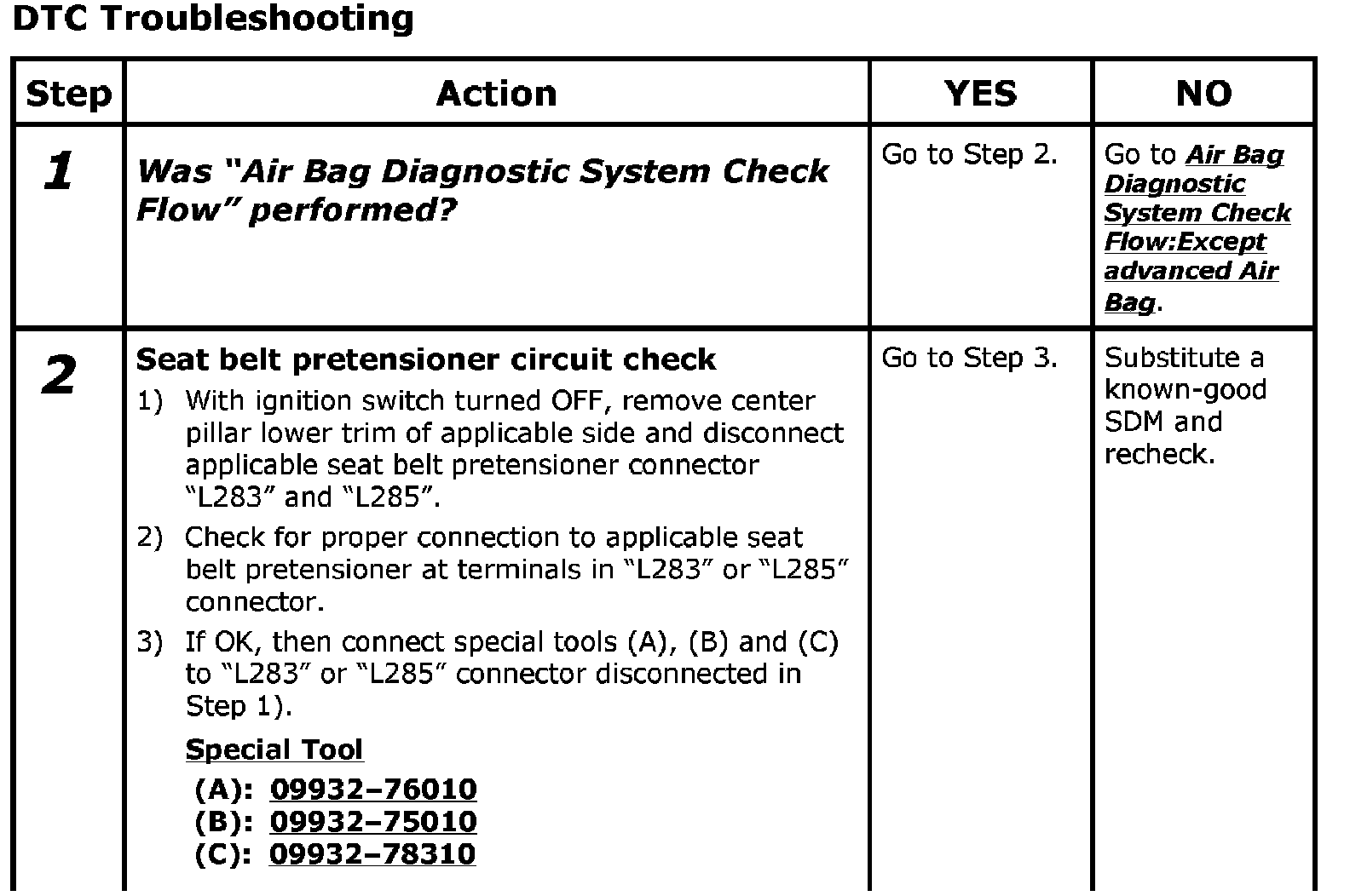 - Repeat Air Bag Diagnostic System Check:Except advanced Air Bag Air Bag Diagnostic System Check to confirm that the trouble has been corrected.